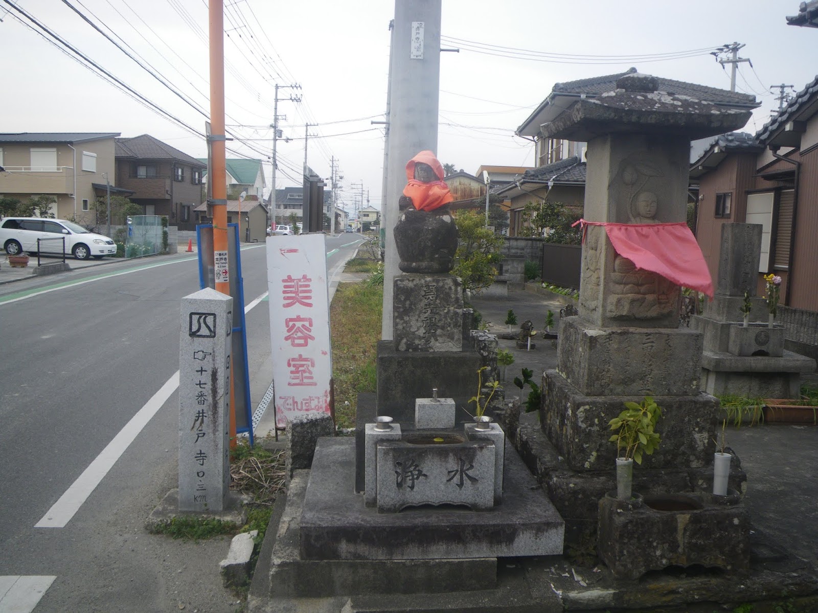 指示に従い右に折れると四つ辻手前に庚申塔。その角を左折れ北に向かう。道の右手に庚申塔や五輪塔などの石仏を見遣り北に進むと井戸寺の山門前に着く。