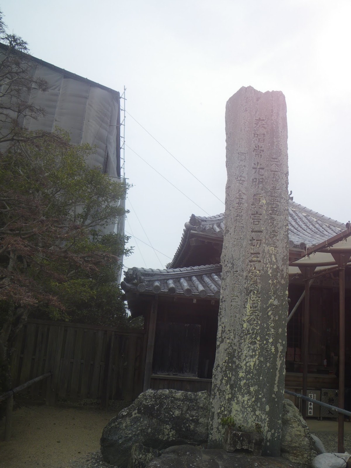 「聖武天皇勅願所 四国第十五番 曹洞宗国分寺」と刻まれた寺標石が立つ山門を潜り境内に。正面の本堂は国指定名勝である庭園と共に2020年3月31日完成予定での修理工事中。その間、本堂右の烏枢沙摩明王(うすさまみょうおう)堂が仮本堂となっている。