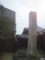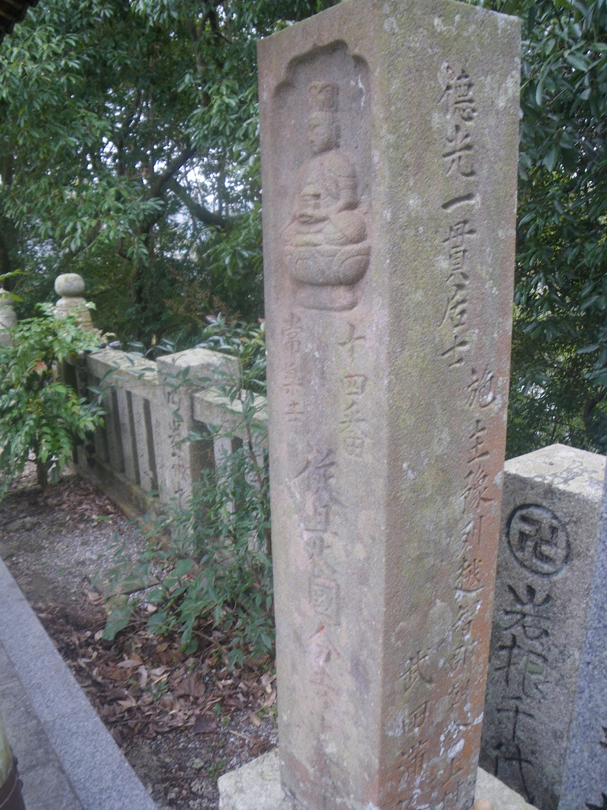 国分寺を出て次の札所観音寺に向かう。この間の距離も短く2キロ弱。大師堂裏の東口から出て少し北に歩くと、道の左手、ブロック塀の前に少し傾いた標石。市正面の下部は破損し、大師座像の下は「四国」の文字だけしか読めない。「四国中千躰大師」と刻まれた照蓮の四国千躰大師標石だ。
