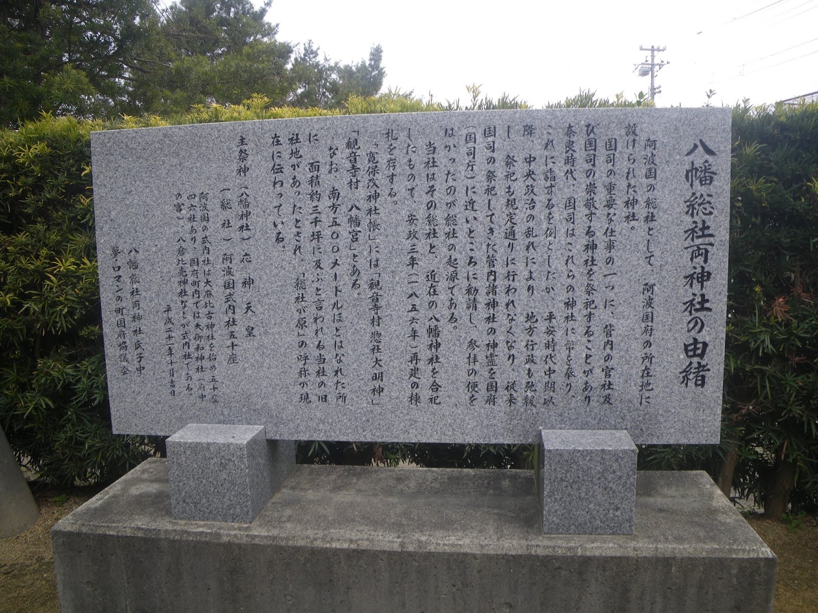 八幡総社両神社の由緒には「阿波国の総社とし、阿波国府の所在地に設けられた神社。国司の重要な仕事の一つに、管内の官社及び国司の崇敬する神社を祭祀することがあり奈良時代、国司はこれらの神社に幣を奉りこれに詣するを例としたが、平安時代中期以降、中央政治の乱れにより、地方行政も弛緩し、祭祀も規定通り行われなくなり、従来、国司の祭祀してきた管内諸神社の神霊を国府 (国司庁)に近いところに勧請し、参拝の便をはかったのび総社の起源である。当社はその総社と、近在の八幡神社を合祀したもので、安政三年(一八五六年)再建の棟礼を存する。