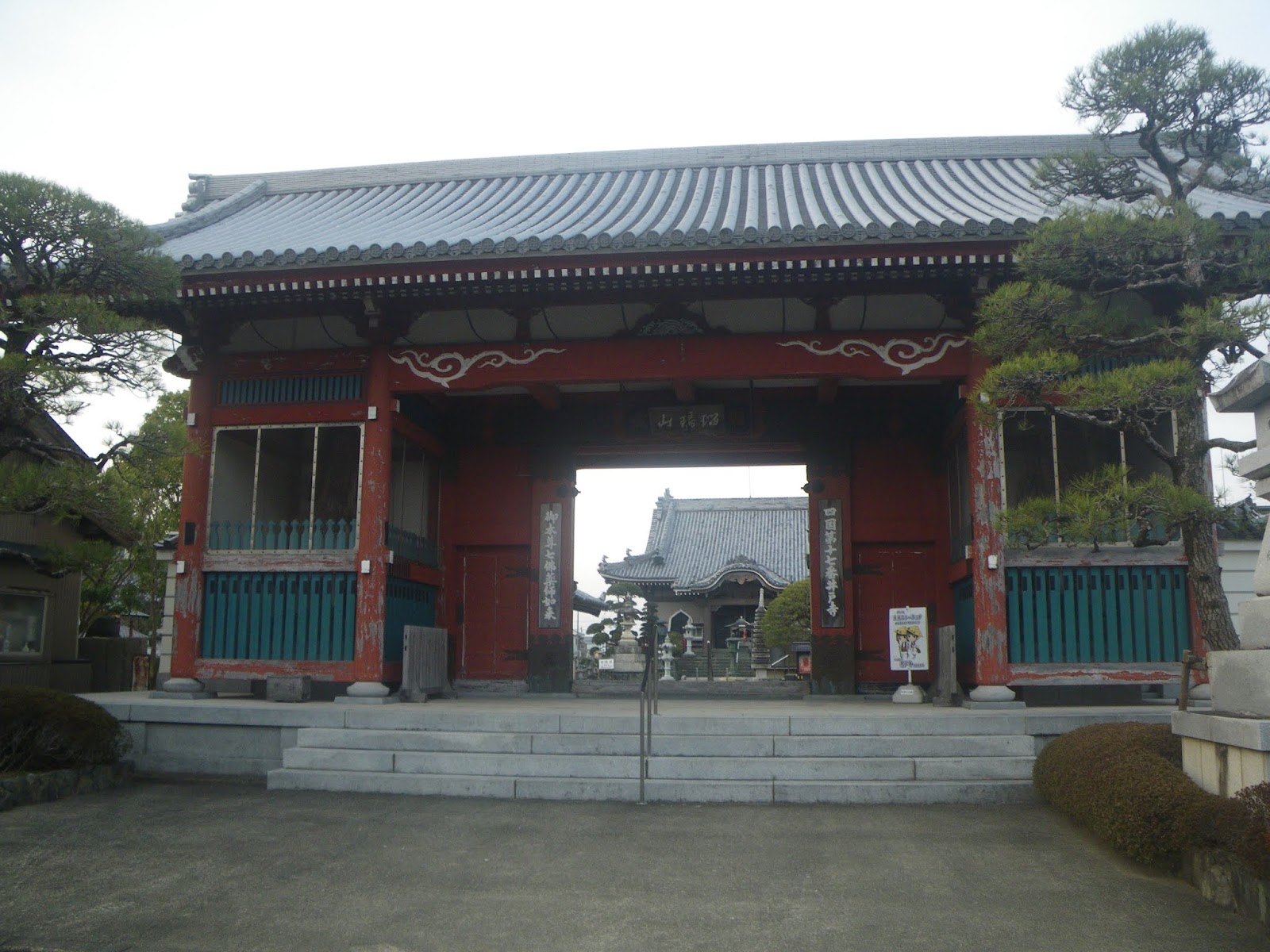 朱塗の山門を潜り境内に。何となく武家風の造り。元は徳島第十二代藩主蜂須賀重喜公の別邸の門を移築したもの。平成元年(1989)に新しい山門建設が行われたとのこと。屋根瓦や梁は新しそうだが、柱には古き趣が残る。