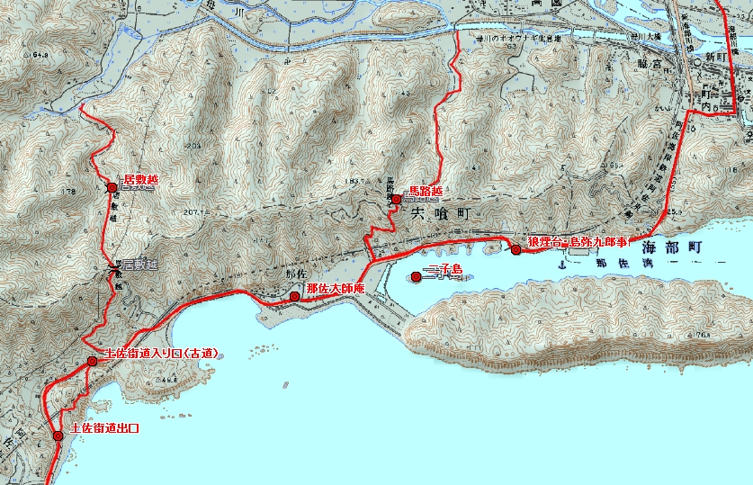 遍路道は野根の街を出て野根川手前で国道493号に合流する。この国道493号の道筋は往昔の野根山街道。土佐湾の奈半利から野根山連山を尾根伝いに進み、この野根に至る。上述土佐北街道が開かれるまでは土佐藩主参勤交代の道であった。