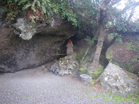 坂を上ると直ぐ広場。岩場に洞窟が見える。洞窟入り口「第廿四番奥の院」の石碑が立ち、七観音と大師像が並ぶ。間口が幅1.2m,高さ2.3m,奥行き9mの洞内には小さ祠が祀られていた。