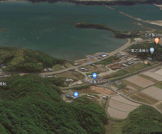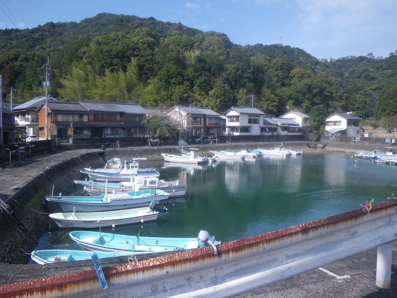 西に入り込んだ西股の北に沿って道は進む。西股の南岸に御殿跡と地図にある。土佐藩初代藩主山内一豊公が土佐に最初に上陸した地であり、参勤交代の折の御殿や船蔵があったようだ。御殿は宝暦の大地震の後は現在の甲浦小学校のある地に移った。西股南の丘陵には藩政以前、この地に割拠した豪族の城跡が残るとのことである。甲浦の湊口には葛島、二子島、竹ヶ島(徳島県)が並び、沖の波浪を遮り、古くからの天然の良港。土佐と上方を結ぶ船運の要衝の地であったようだ。