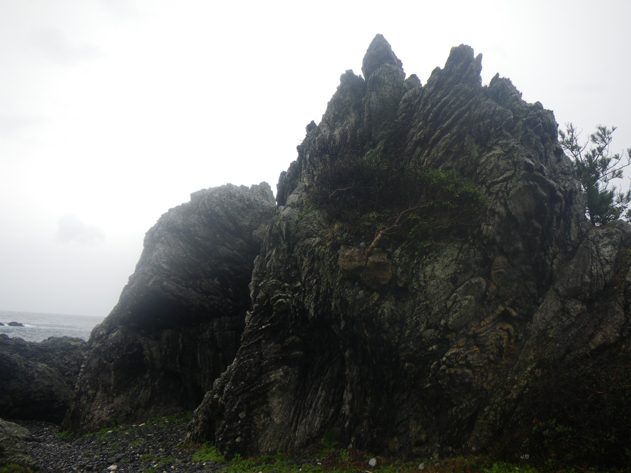 烏帽子岩から南は付加体・砂岩泥岩の岩質層(上掲載地質図の薄緑部)となる。縦に縞模様が刻まれる奇岩があり、タービダイトとある。タービダイトとは乱泥流堆積物のこと。砂や泥が海水と混ざった流れによって海底に降り積もってできたシマシマの地層のことです。奇岩の縦じまは水平に堆積した後、回転して立ち上がったため縦向きの縞模様になったようだ。