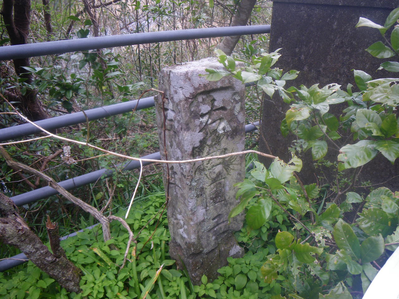 広場の洞窟対面には忠魂碑。昭和40年建立。日清戦争以降の戦没者の霊を祀る。最御崎寺への遍路道はこの忠魂碑脇、ブロック塀の脇の道に入る。入り口には「最御崎寺 本堂 六九六米」と刻まれた標石が立つ。