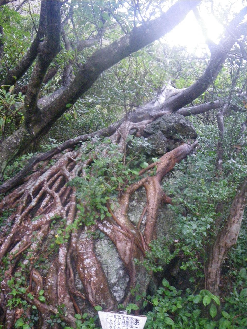 コンクリートで固められた石段を数分のぼると「捻石」の案内。大師の母である玉依御前が、修行中の大師の身を案じてここを訪れた際ににわかに暴風雨となったため、大師がこの岩を捻じってその中に避難させた と伝えられる。