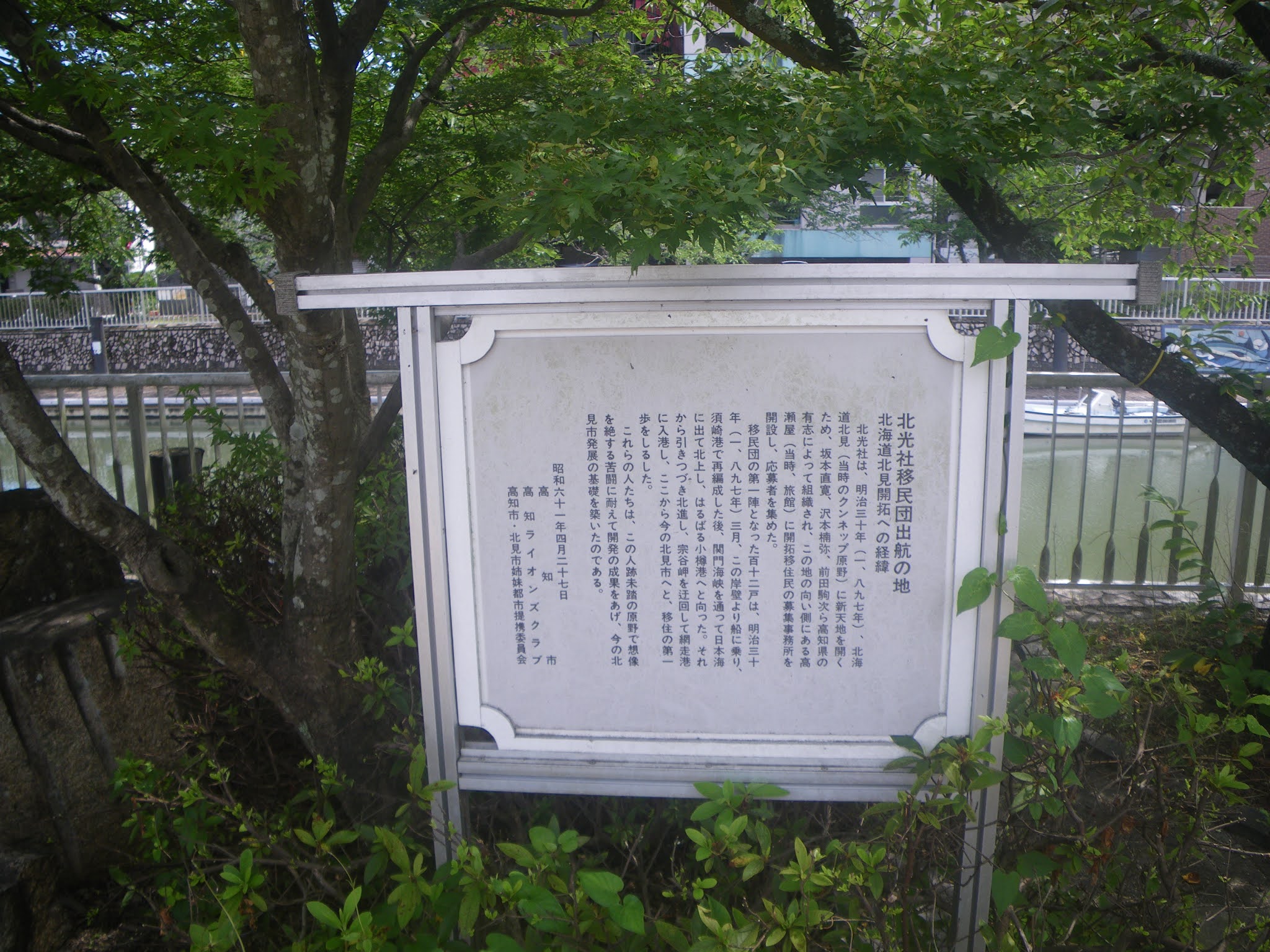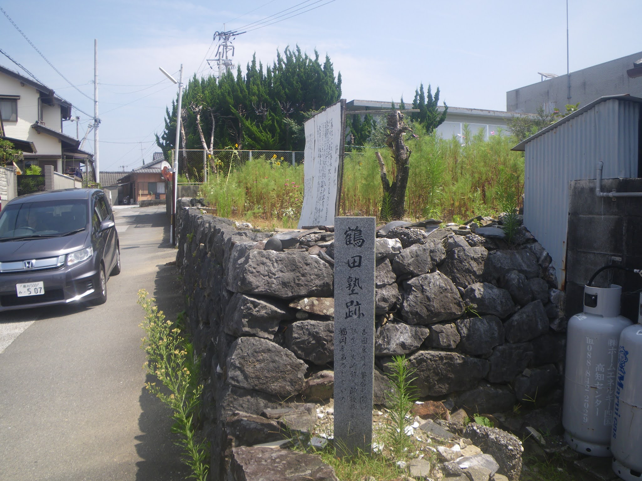 「鶴田熟跡 幕末の土佐藩政吉田東洋が蟄居中に開いた熟跡 熟生に岩崎弥太郎、、後藤象二郎、福岡孝弟などがいた」と刻まれる。傍に手書きの案内。「鶴田熟跡 幕末の土佐藩政吉田東洋が蟄居中に開いた熟跡である。東洋は安政元年(一八五四)、江戸出府中に、酒癖の悪い山内家親戚の幕府役人を接待していて、頭をなぐったため罰せられた。翌年四月、長浜の鶴田に塾を開き、安政五年(一八五八)一月、参政に復帰するまで、ここで子弟の教育につとめ、後藤象二郎、福岡孝弟、岩崎弥太郎らの門弟を養成した」とあった。