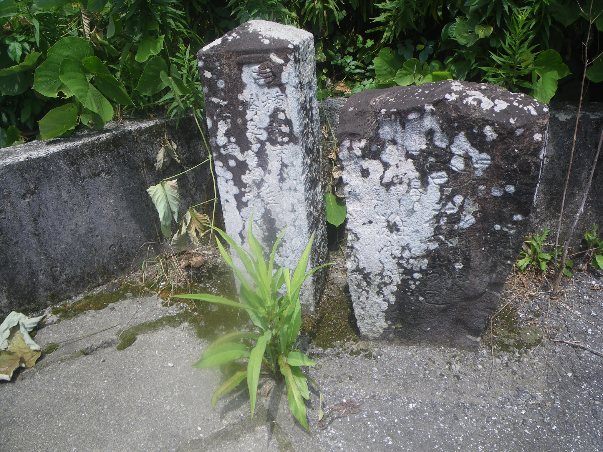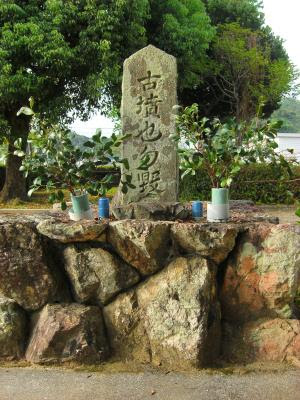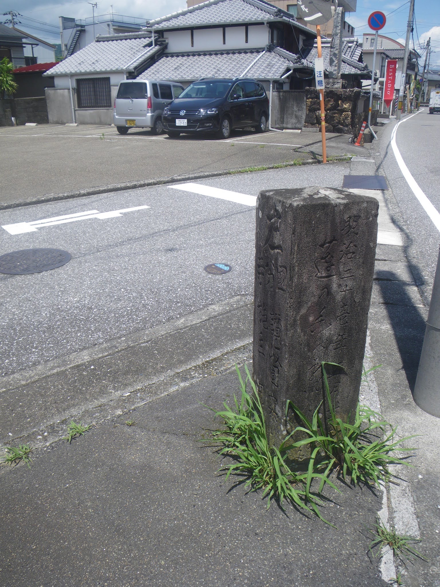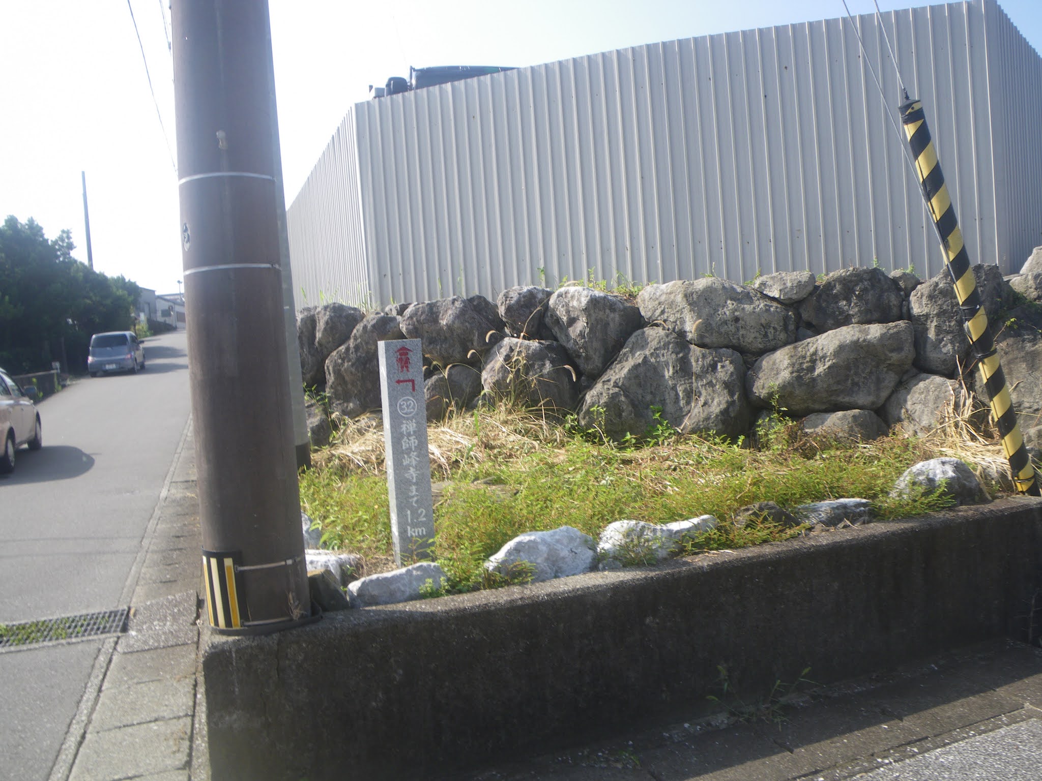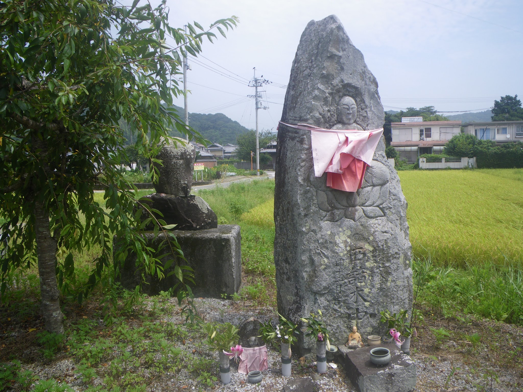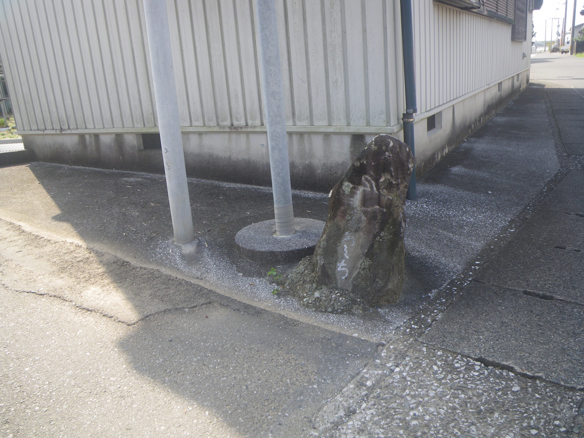 新川川に沿って県道278号を西進。しばらく歩くと道の右手、T字路を少し北に入った石垣の前に石碑があり