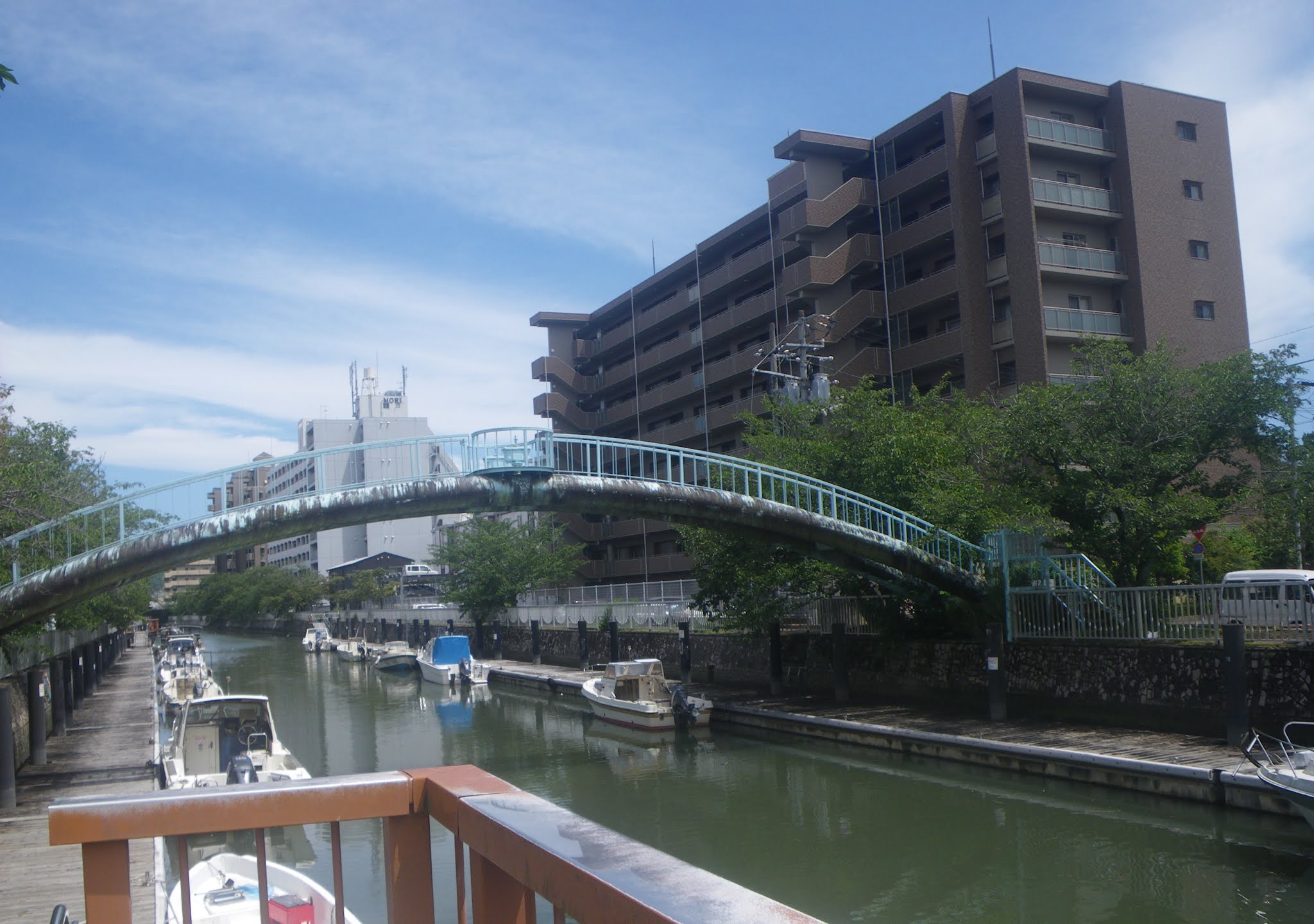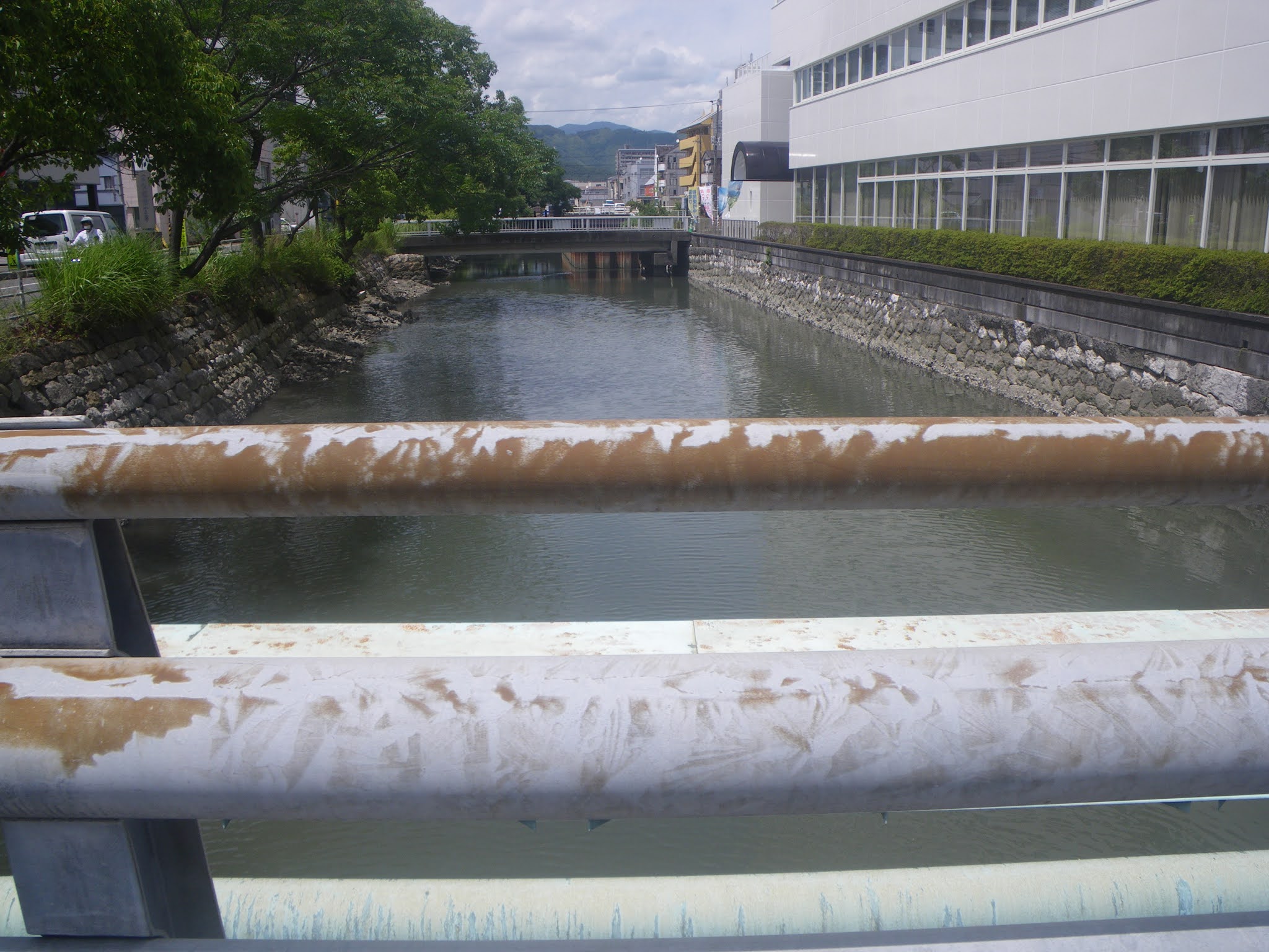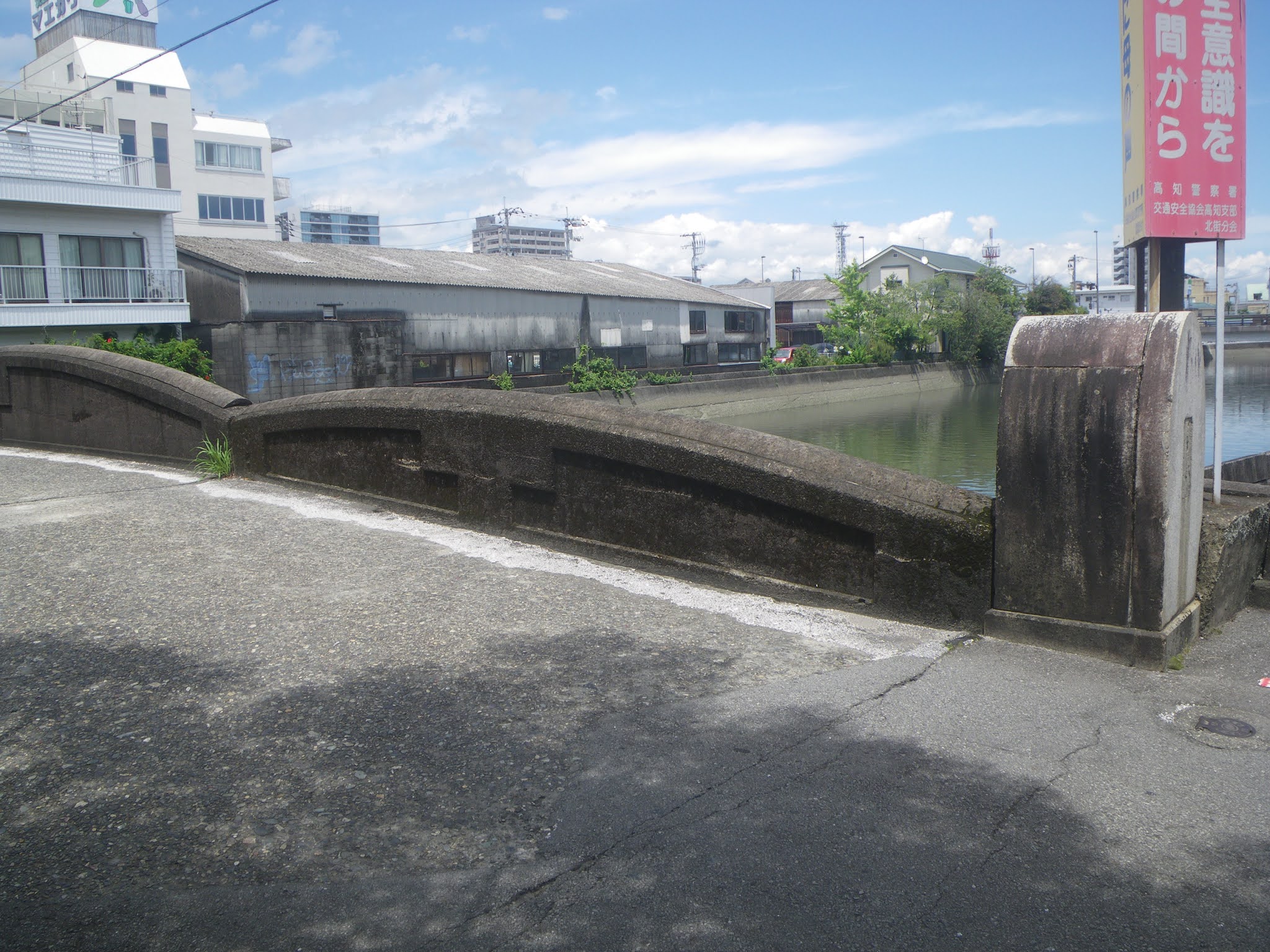 橋には新川川とある。Google Mapには甲殿川とある。地図をトレースすると人工的に開削された新川川が広岡下で北から下る流れに合流するが、その上流部はGoogle Mapでは甲殿川となっている。以下は妄想であるが、仁淀川から浦戸へと抜いた人工水路の総称が新川川。途中、人工的に開削するだけでなく、既にあった仁淀川の支線(往時、流路定まることはなかっただろうから)を浚渫し新川川水路として活用したのが甲殿川。人工水路新川川の水を落とした甲殿川は新川川水路の本流となたため、新川川ともまた本来の流れである甲殿川とも呼ばれるのではないかと思う。