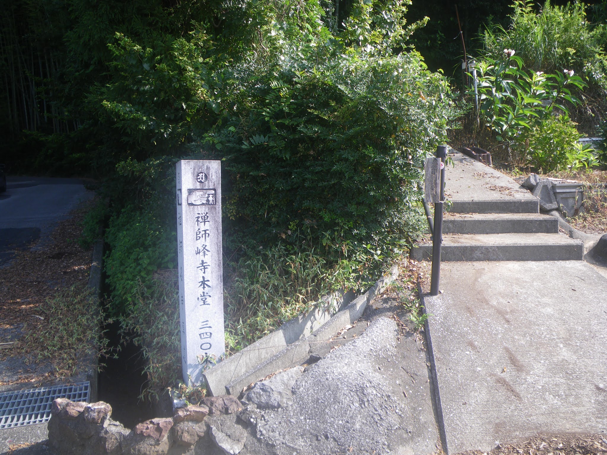 参道口はふたつに分かれる。左は車道参道、歩き遍路は直進する。参道口には手印と共に「禅師峰本堂 三四〇米」と刻まれた標石が立つ。
