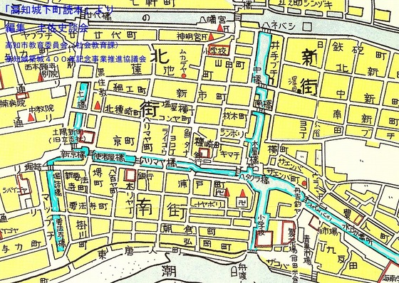 もっとも、現在でも新川川が往昔と同じ機能を果たしているということが大前提。そのあたりのことも気になるが、これも後の祭り(国土交通省の「新川川水系河川整備」の資料には、「唐戸で内の谷川が新川川に合流し」浦戸へ注ぐ、とあるから、現在の新川川・内の谷川の流れも浦戸湾へと流れているようにも読める。。。)