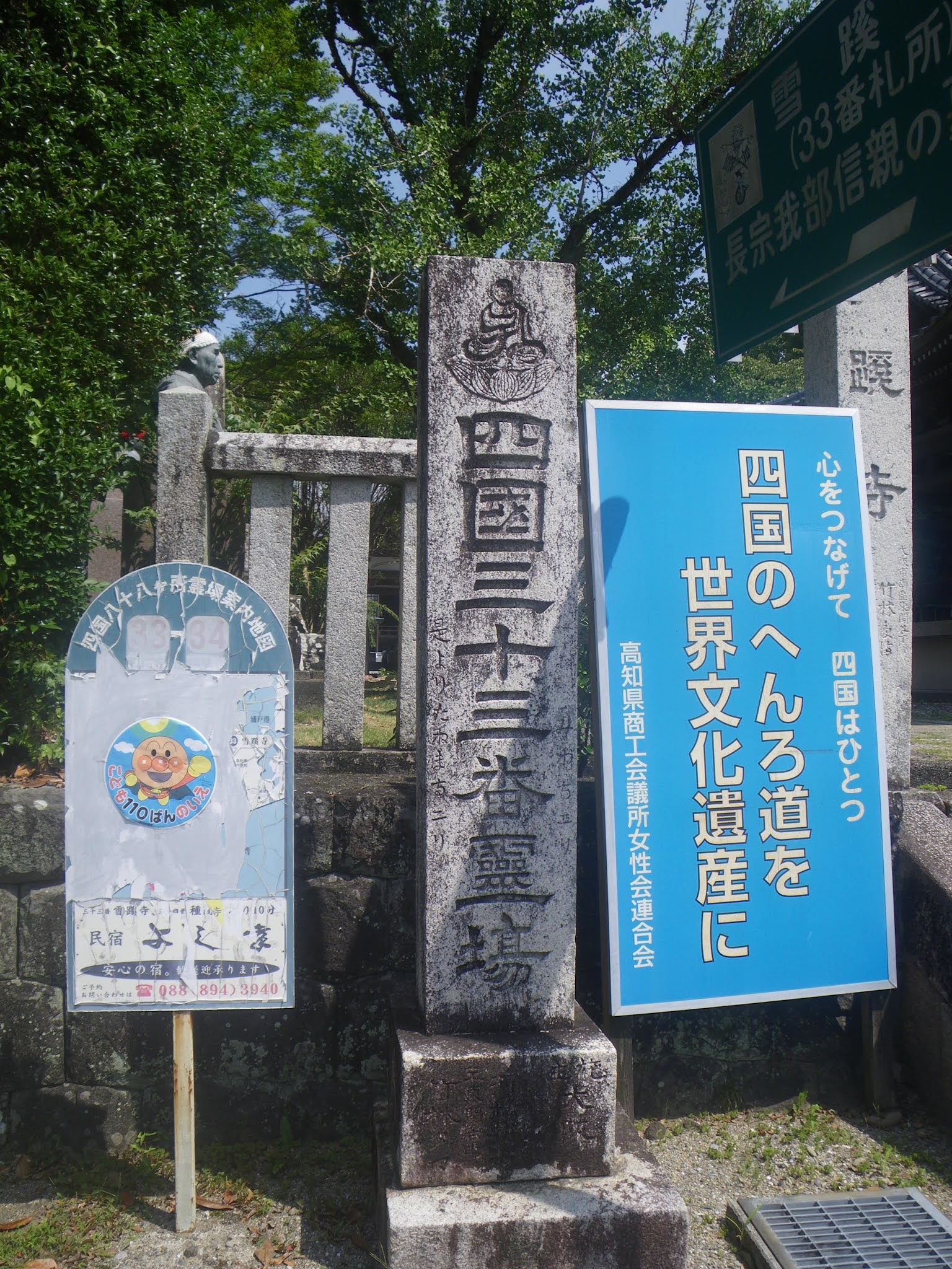 集落の間の生活道を東進すると、前が広場となり道の左手に大きな石仏と小振りな石仏群、標石そして「四国第三十二番霊場 八葉山禅師峰寺」と刻まれた寺標石が立つ。