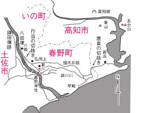 遍路道は新川川の北岸を西進する県道278号を辿る。この新川川は野中兼山によって開削された人工水路。仁淀川の八田堰から取水し、弘岡井(ひろおかゆ)、新川川により一帯を灌漑した後、浦戸湾と結ばれた。仁淀川の八田堰から概略図を書いてみる。地図を見ると人工的に開削された水路と仁淀川の自然分流の川筋を繋ぎ合わせ浦戸湾に続けているようだ。特に南北に流れる甲殿川などは人工的に開削した人工水路(新川川)を落とした自然水路のように思える。人工水路と自然水路を組み合わせた治水・利水事業はよく見る。利根川の東遷事業で源頭部を失い廃川となった古利根川の流路を改修し葛西用水の流路として活用した大落古利根川などが記憶に残る。
