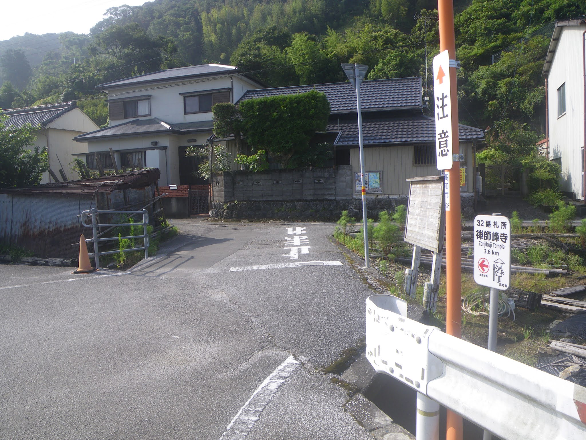 石土川から注ぎだす十市川に架かる石土橋を渡ると県道14号。遍路道は県道合流点を右折し、すぐ県道を左に折れる。そこに「32 禅師峰寺1.2km」と刻まれた新しい標石があり、「すぐ先左折」の矢印が記される。