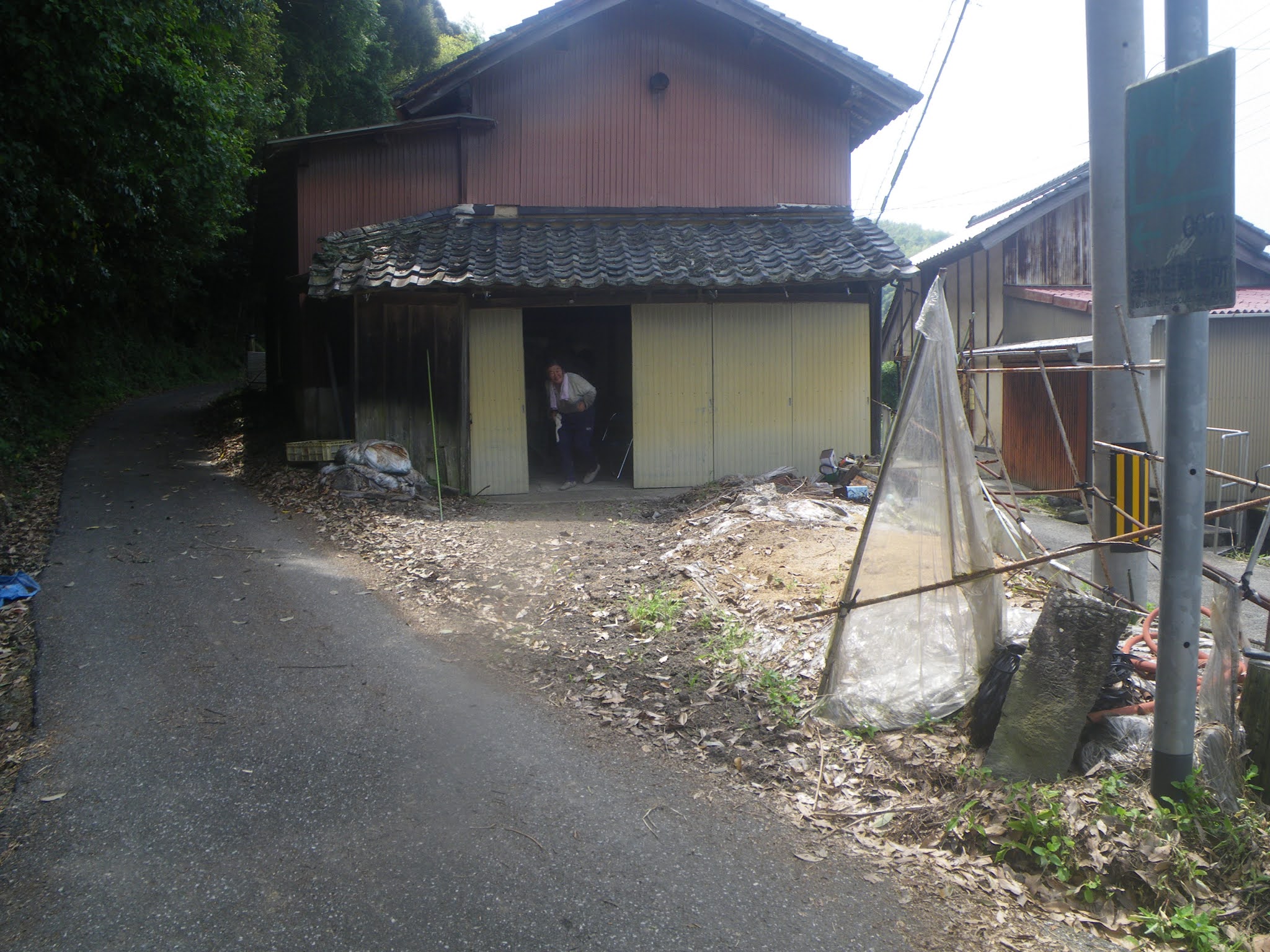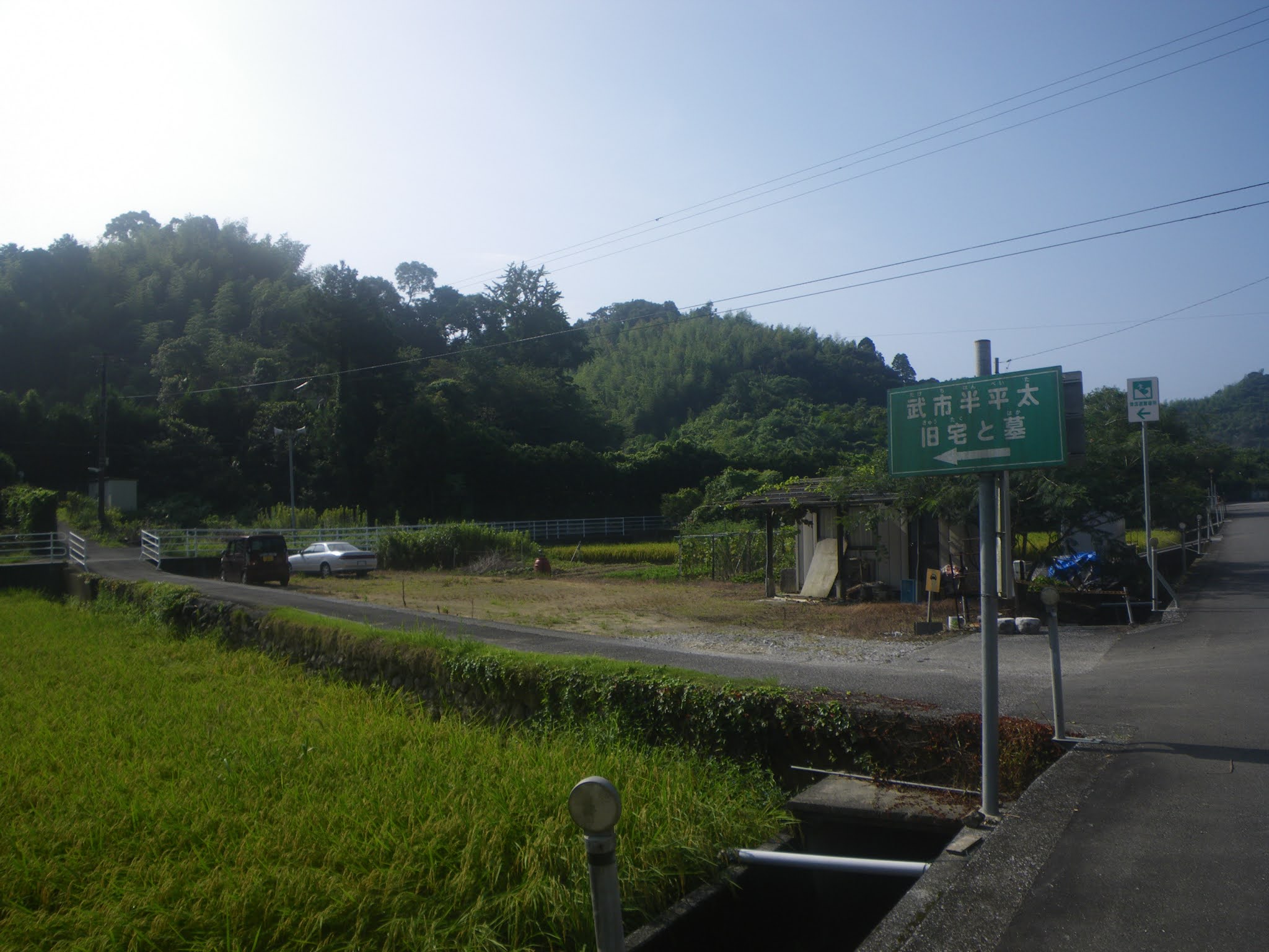 ほどなく県道の左手に「武市半平太 旧宅と墓」の案内。ちょっと立ち寄り。県道を左折し、侵食・開析され(?)東西に分かれた大畑山山地の東側山裾に「武市半平太 舊宅及墓」の石碑があり、古家がその左に建つ。