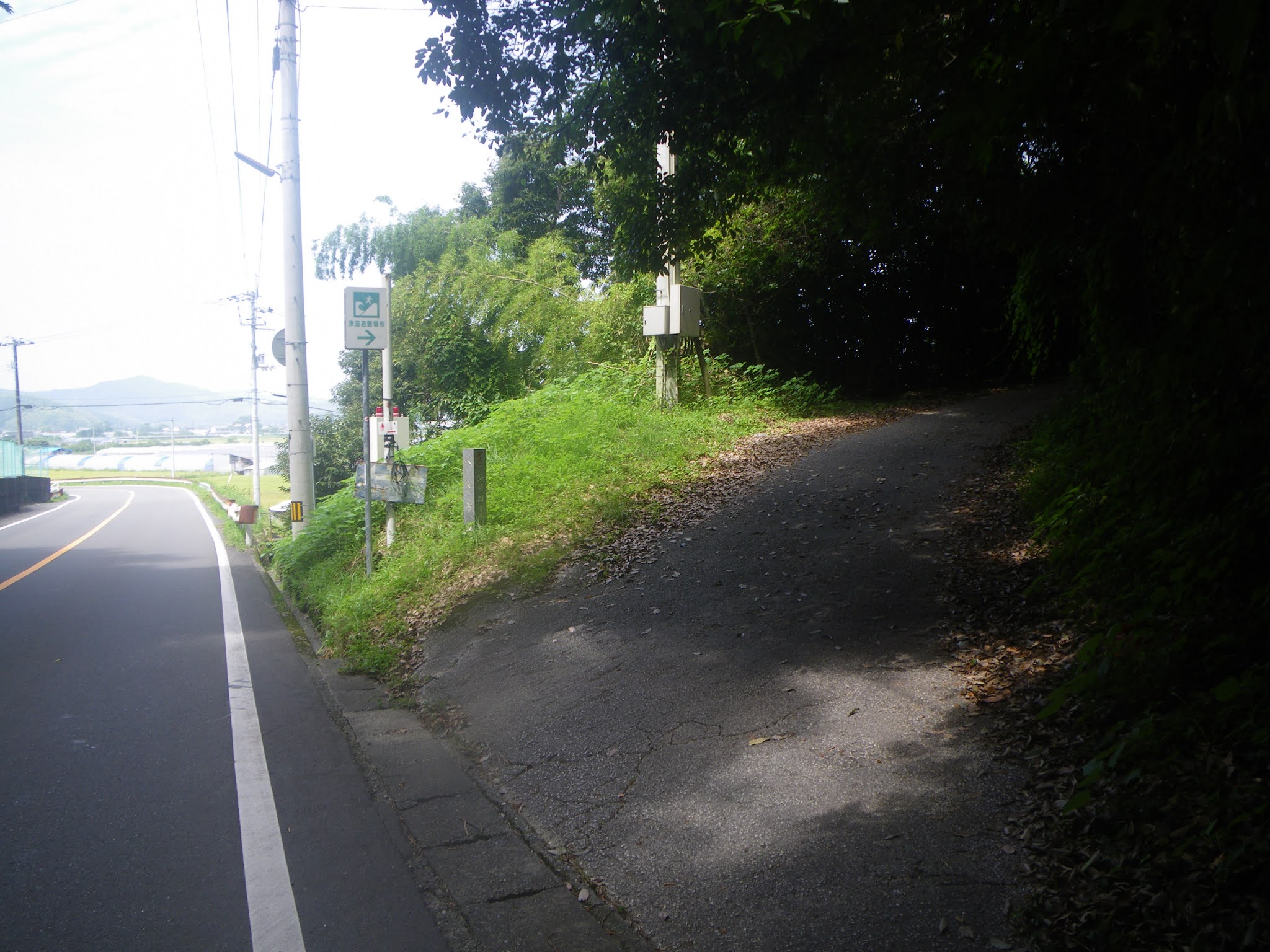 よく見ると分岐点には「尾根道散策コース」の案内。峰寺>栗山>札場へと独立丘陵の尾根道を進むハイキングコースの案内が雑草に埋もれるように置かれていた。少し注意しなければならない分岐点だ。