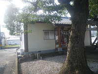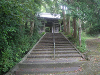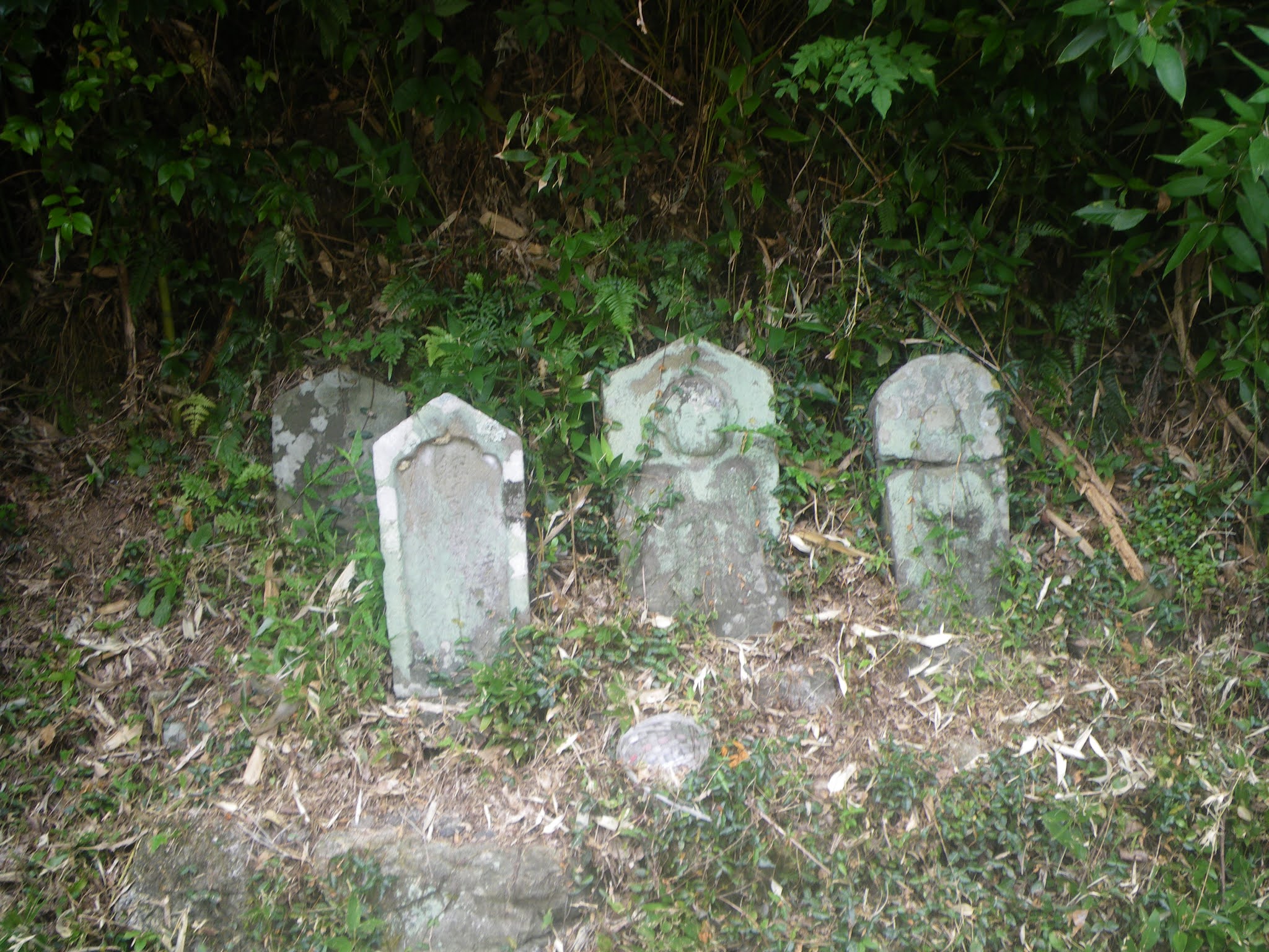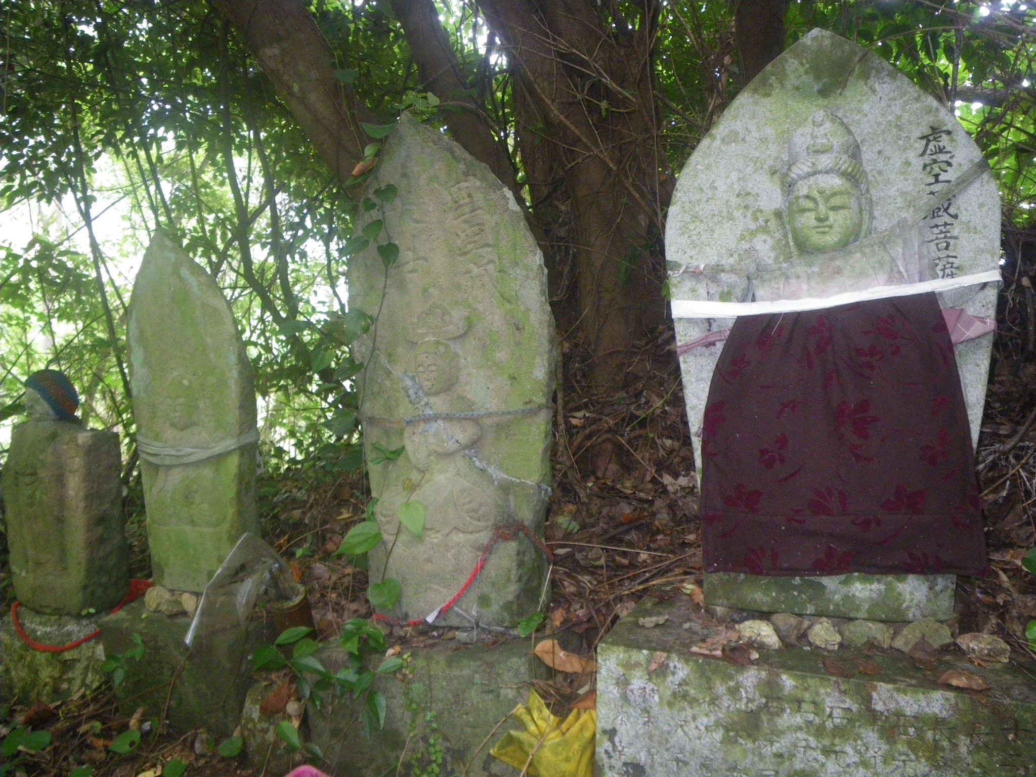 水場を過ぎるとほどなく舗装された道に出る。そこで小休止。少々荒れてはいるが簡易舗装の道を進み、「あと900m「あと1100m」、「へんろ道 青龍寺7000m 塚地峠1200m」の標識の先で沢に架かる橋を渡り、「塚地峠1.3km 青龍寺5.3km(私注;7キロから5.3キロに急に減っている)」の傍にある「金剛杖の返却箇所で上り口でお借りした杖を戻す。その間、上部の欠けた石仏、遍路墓、舟形地蔵などが道脇に立っていた。 上りはじめてから1時間半。膝を痛めているとはいえ、ちょっと時間がかかりすぎ。