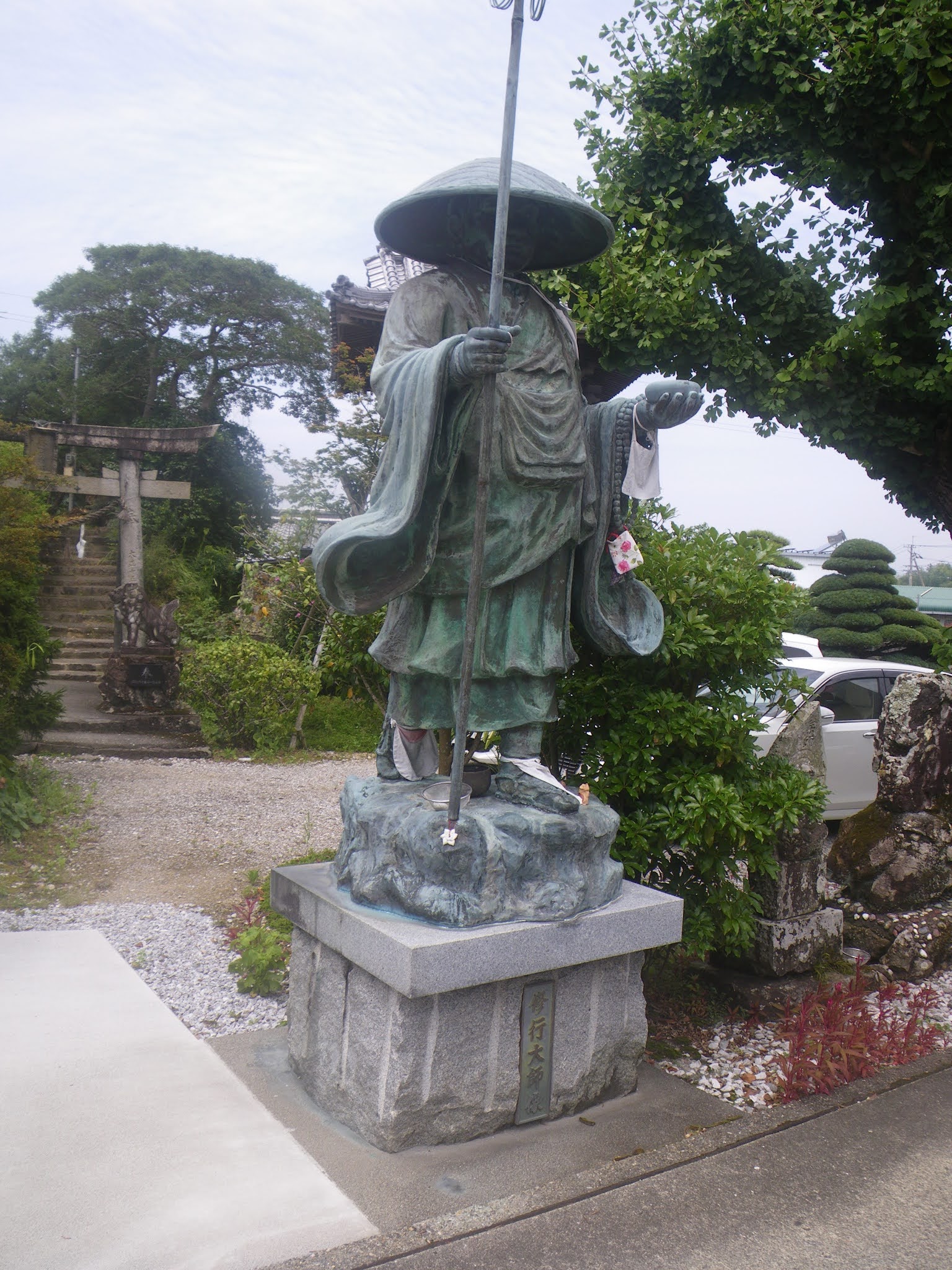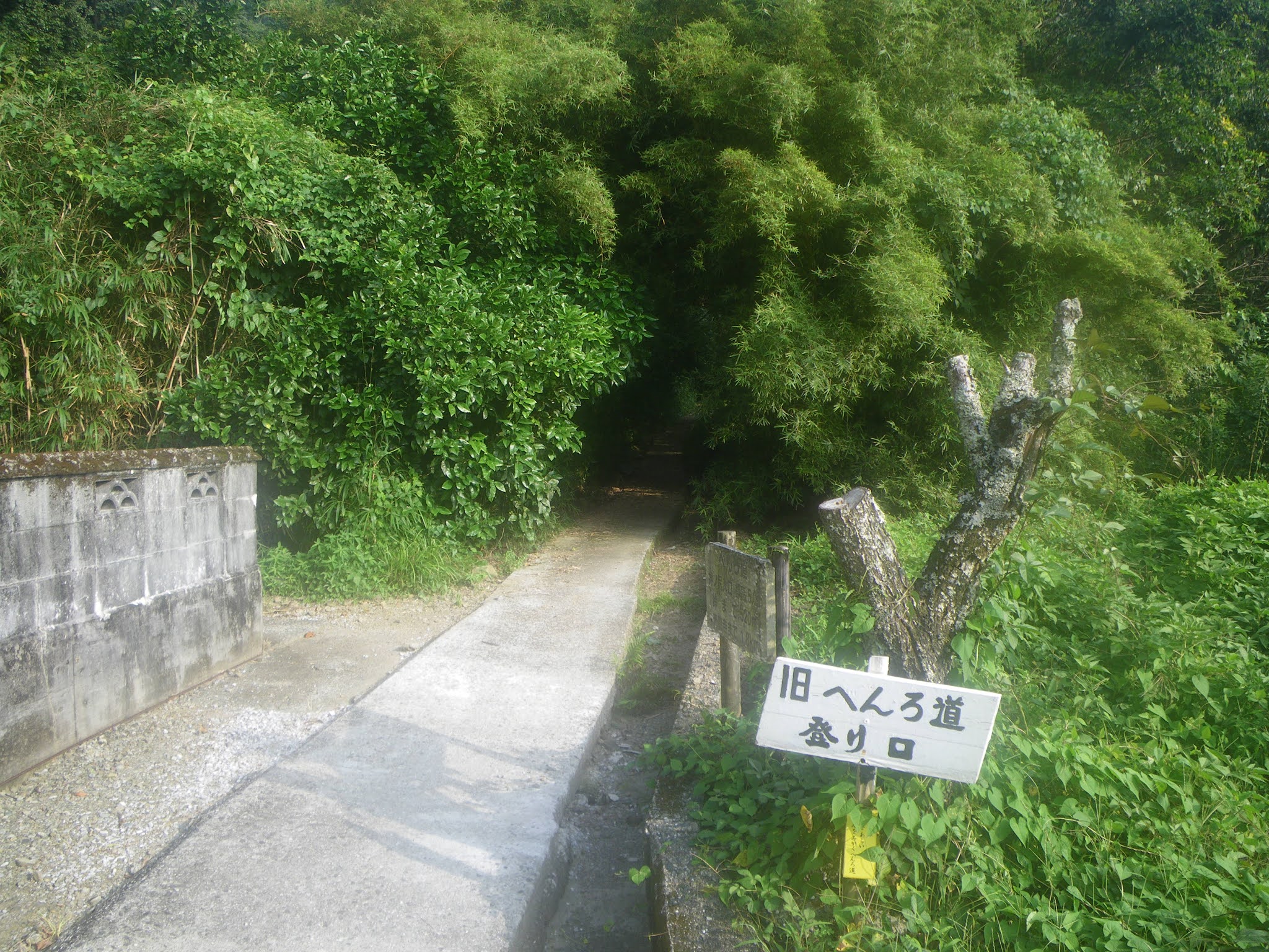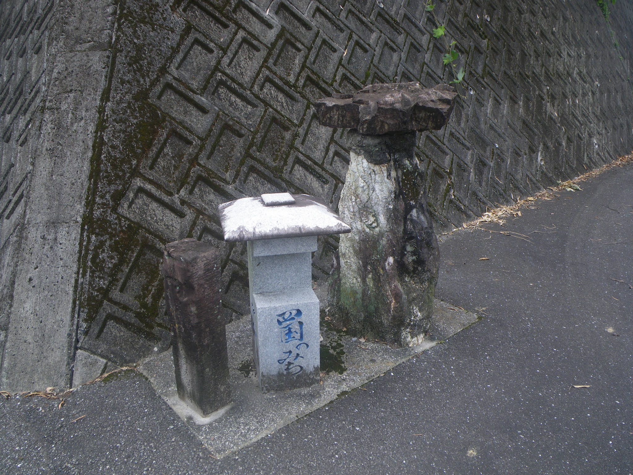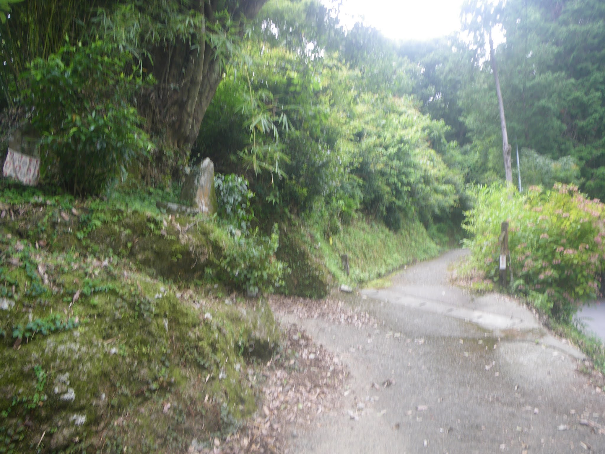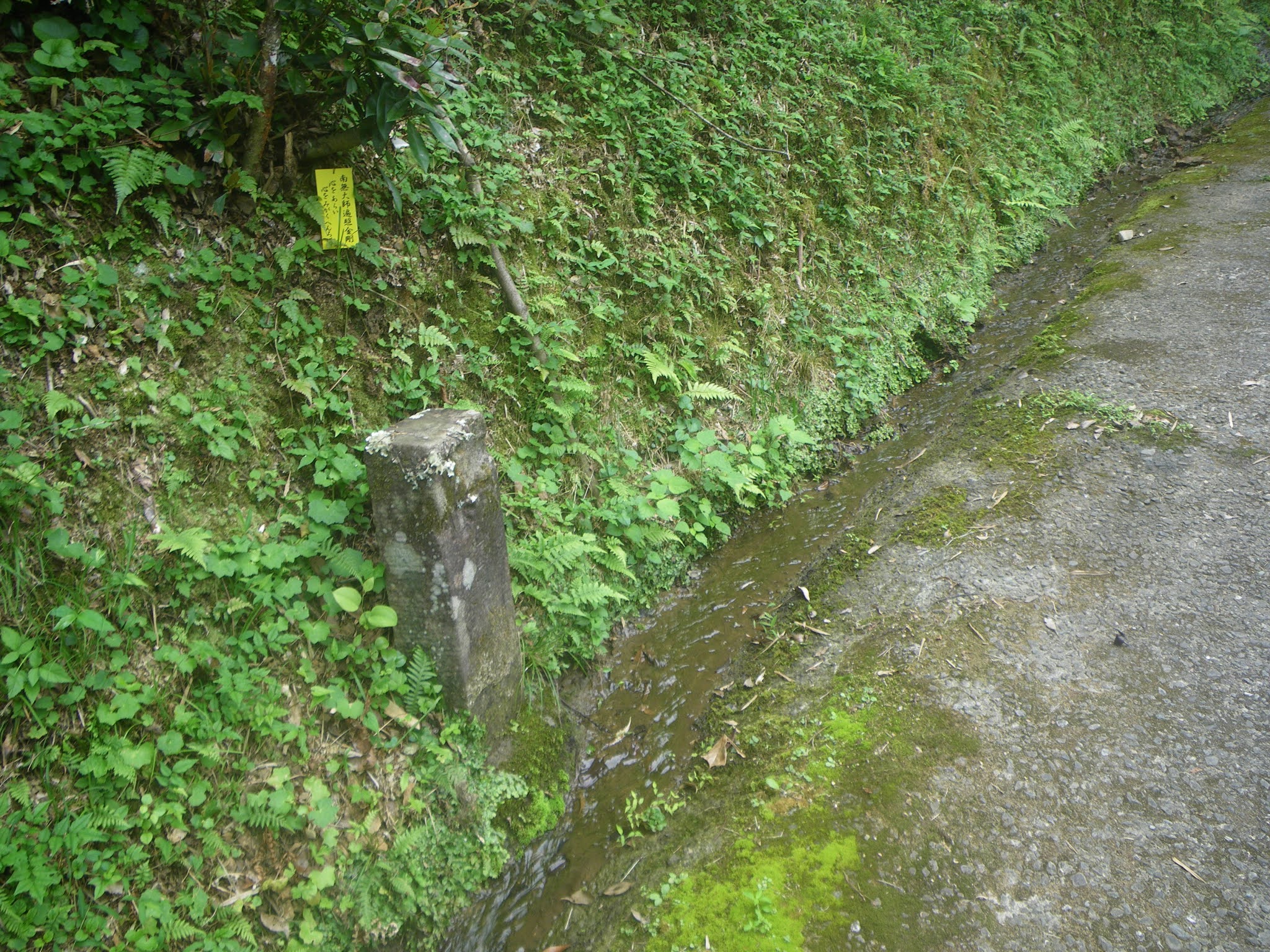 水場を過ぎるとほどなく舗装された道に出る。そこで小休止。少々荒れてはいるが簡易舗装の道を進み、「あと900m「あと1100m」、「へんろ道 青龍寺7000m 塚地峠1200m」の標識の先で沢に架かる橋を渡り、「塚地峠1.3km 青龍寺5.3km(私注;7キロから5.3キロに急に減っている)」の傍にある「金剛杖の返却箇所で上り口でお借りした杖を戻す。その間、上部の欠けた石仏、遍路墓、舟形地蔵などが道脇に立っていた。 上りはじめてから1時間半。膝を痛めているとはいえ、ちょっと時間がかかりすぎ。舗装された道に出て、沢を左手、右手そして左手に見ることろで里にでる。