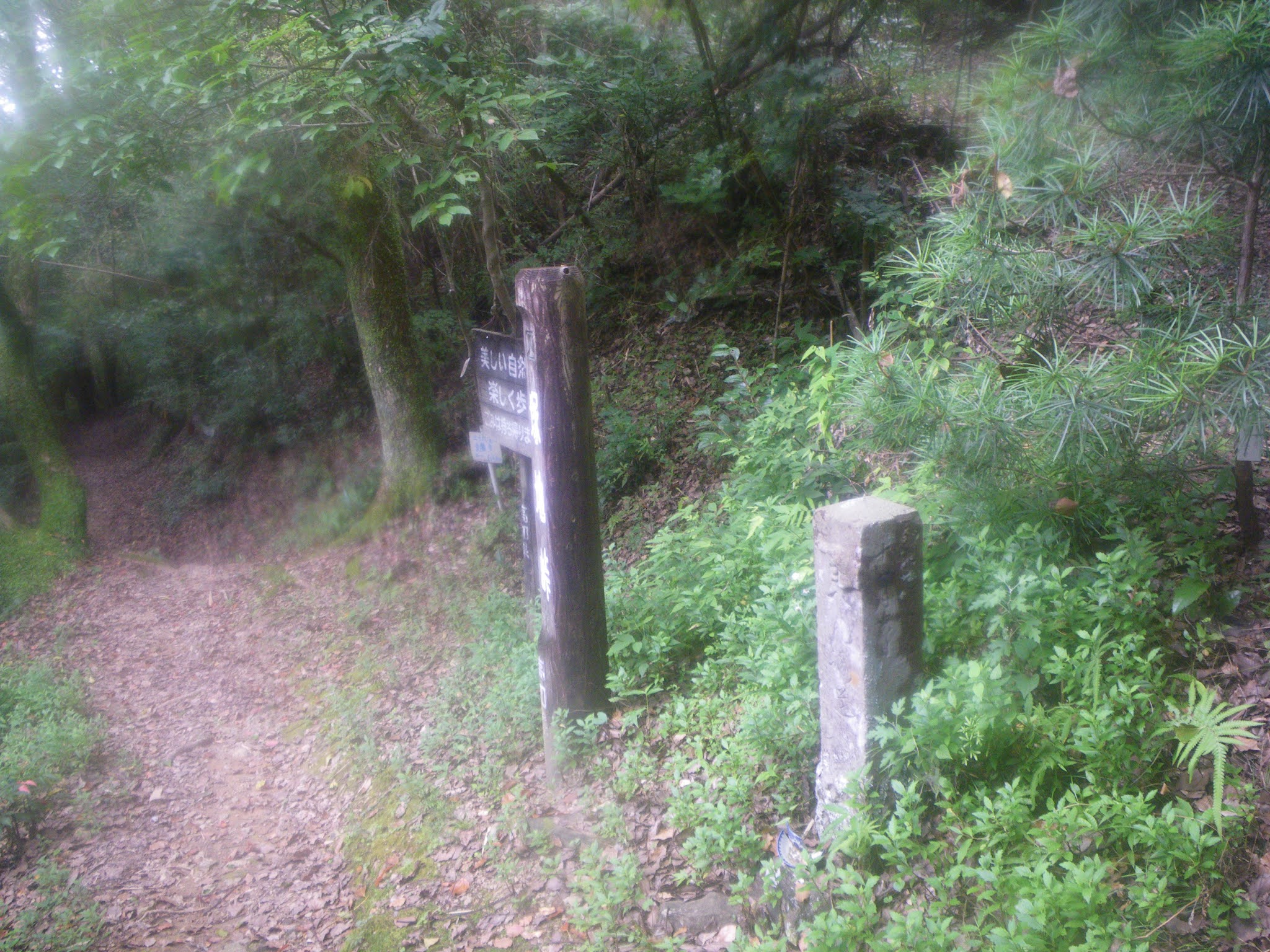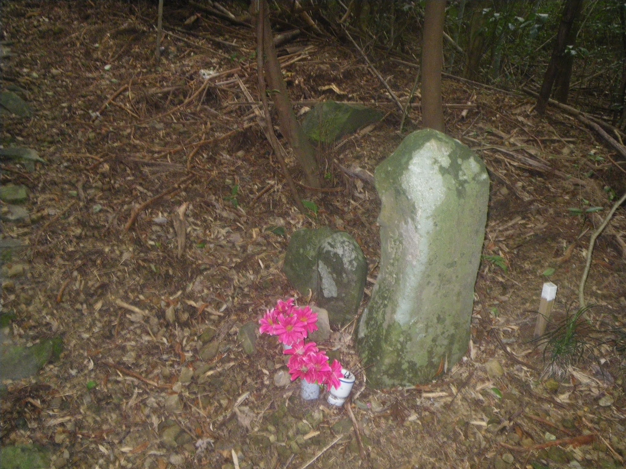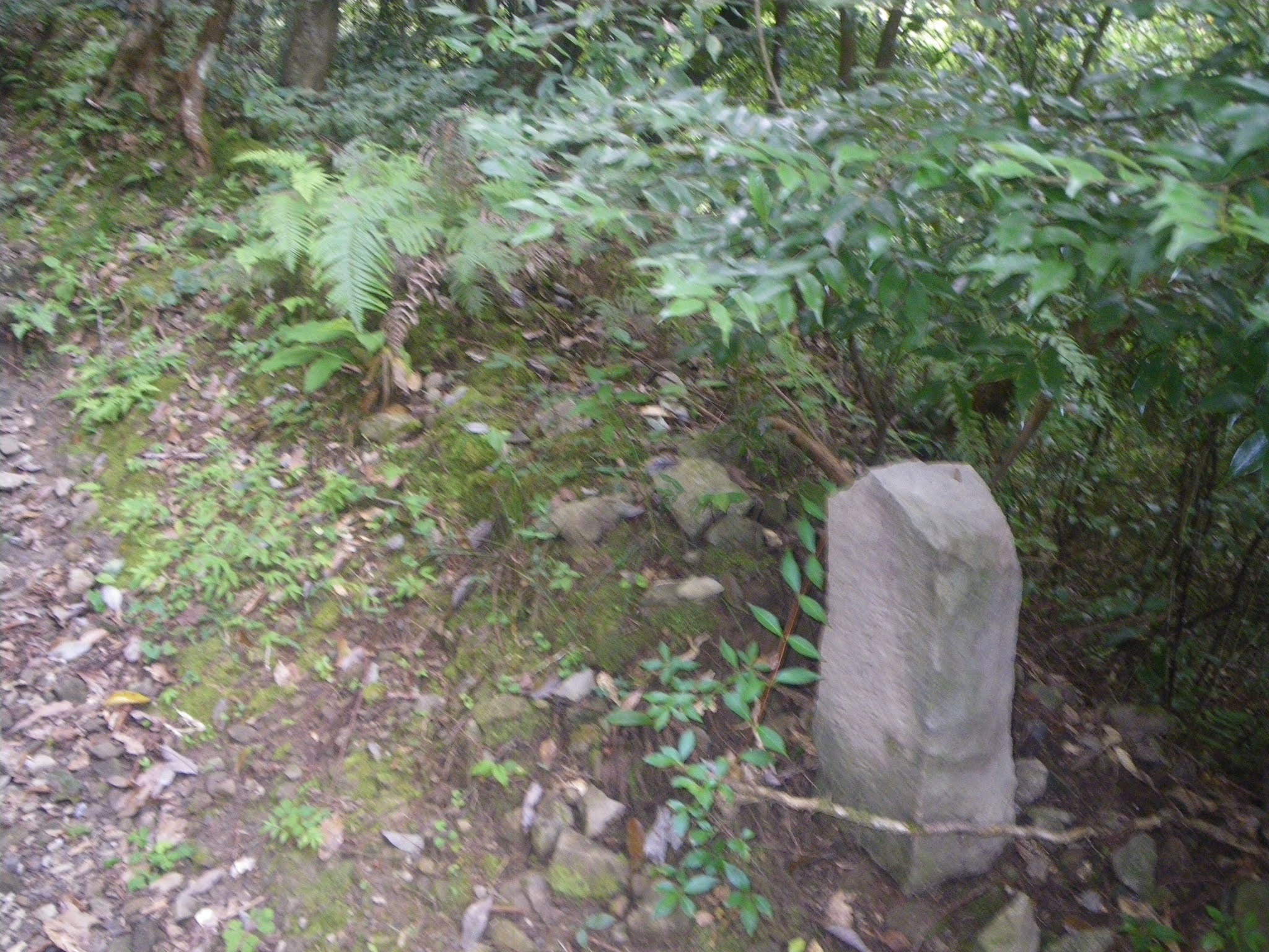 「遍路道 塚地峠あと300m」の案内を越えると2基の石柱。1mほどの自然石には「南無阿弥陀仏」の文字がかすかに見える。供養塔のようだ。小さな石柱は「下 へんろ」といった文字が読める。標石だろう。