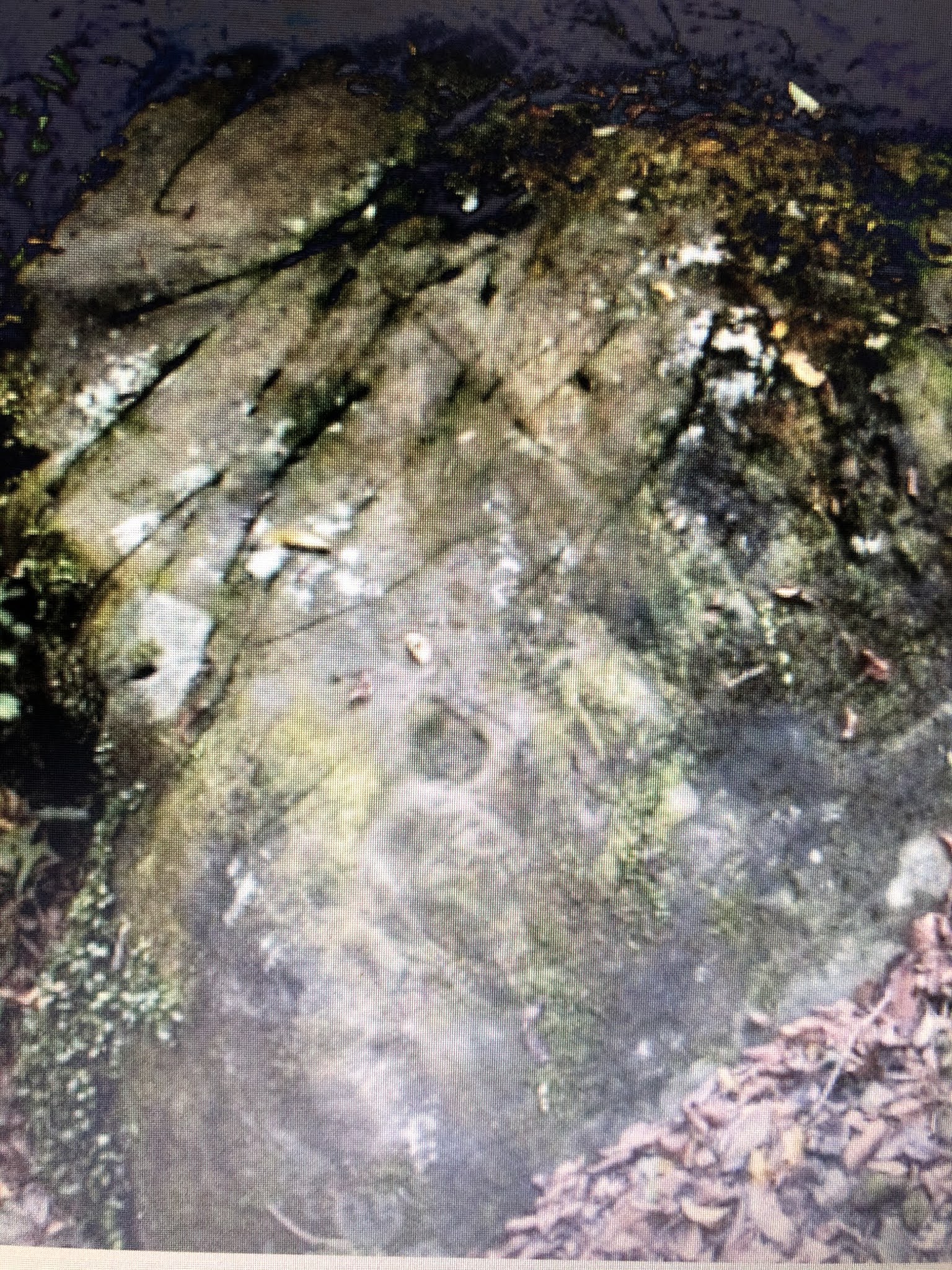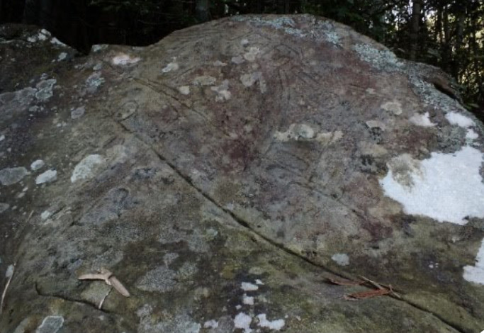 「下りの道半ばを過ぎると、道より上に大岩が傾きほこら状になっている。その斜面を見ると このあたりでは珍しい磨崖仏が線刻で描かれている。