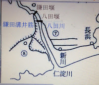 鎌田井堰は下流の八田堰まで舟筏を通す必要があったためか、「水越」を設けられ、「鎌田堰の筏越し」として知られたようである。