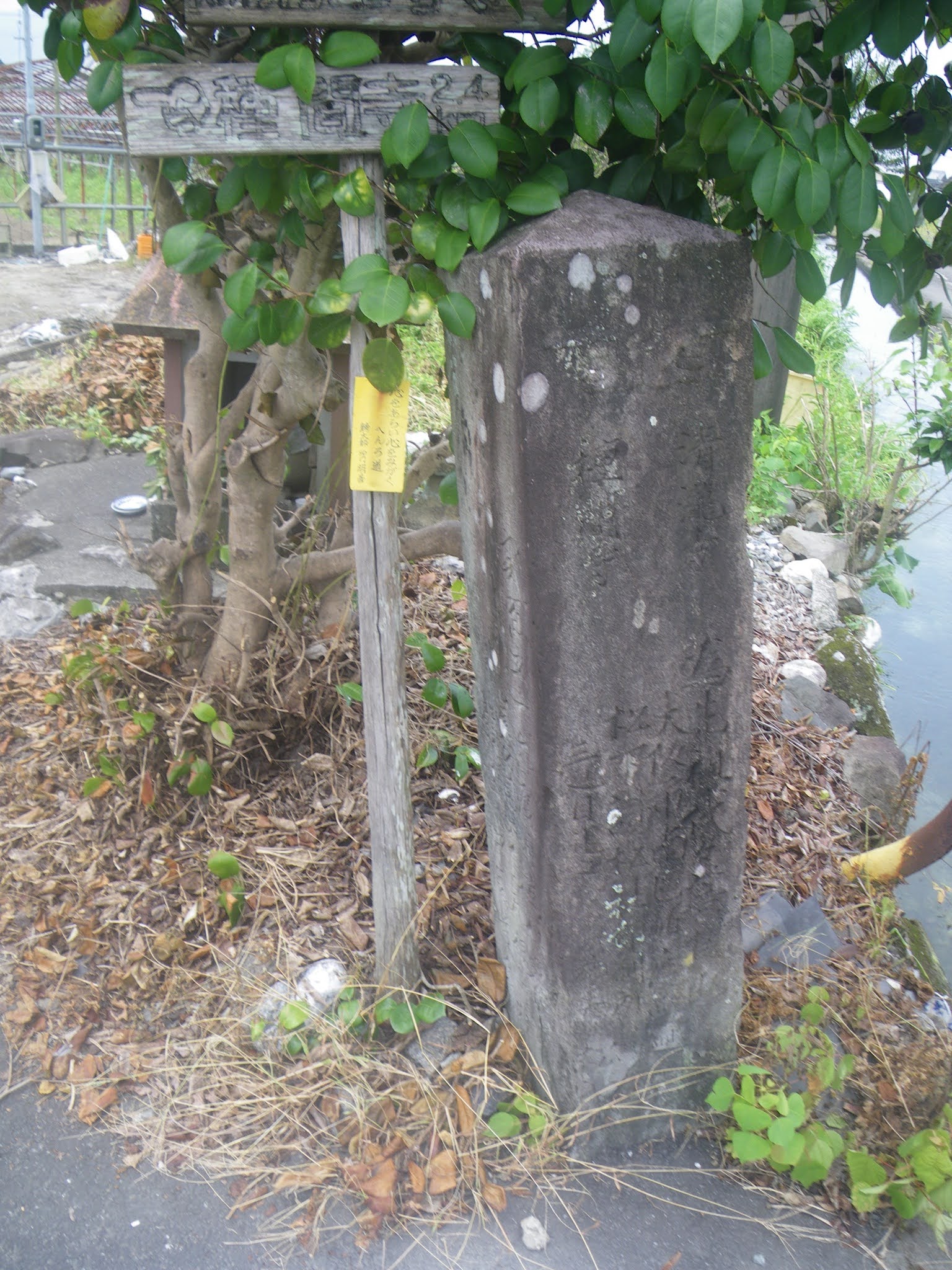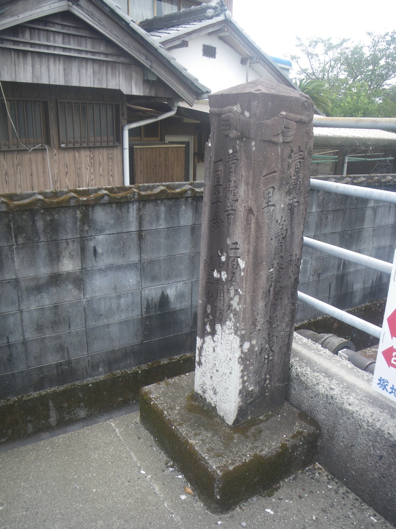 かつての横波半島・井尻への渡し場があっただろう海岸へと西進し、成り行きで次の角を左折すると県道23号に合流。角に上部の欠けた標石があり、「是より青龍寺へ一里十丁 *知へ約六里 昭和三年」といった文字が刻まれるようだ。往昔の渡し場はこの先の海岸辺りにあったようだ。現在宇佐大橋西側の海岸近くに「青龍寺へんろ道 渡し場の跡」の碑が立つ。