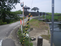 水路(萩谷川)沿いの道を東進、そして南下すると水路が南と西方向に分かれる。その角に3mほどもある常夜灯。現在の遍路道はここを南に進み海岸線に出て宇佐大橋へと向かうが、宇佐大橋が架橋されたのは昭和48年(1973)。今回は架橋以前、お遍路さんが利用した渡船場への遍路道をトレースすることにする。