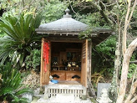 「青龍寺」直進の案内に従い先に進むと次の四つ辻で現在「多くのお遍路さんが歩く東海岸の県道からの遍路道と合流する。四つ辻左角には辻地蔵の小祠がある。