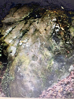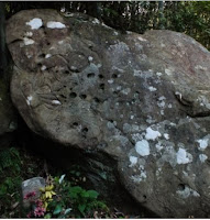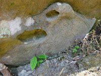 当日歩いた時にこの大岩と前に立つ石仏は見た覚えはあるのだが、その大岩に線彫りの摩崖仏像が刻まれているなど思いもよらず、仏に頭をちょっと下げて素通りした。摩崖仏の説明文を見たときに、大分臼杵の石仏いった崖に彫られた巨大仏と思い込み、見逃してしまった。 そういえば、讃岐の弥谷寺や同じく讃岐の曼荼羅寺奥の院でみた摩崖五輪塔にしても、ちょっと大きめの岩に線彫りで描かれており、その気になって見ないことには摩崖塔であるとはとてもわからなかったことを思い出した。