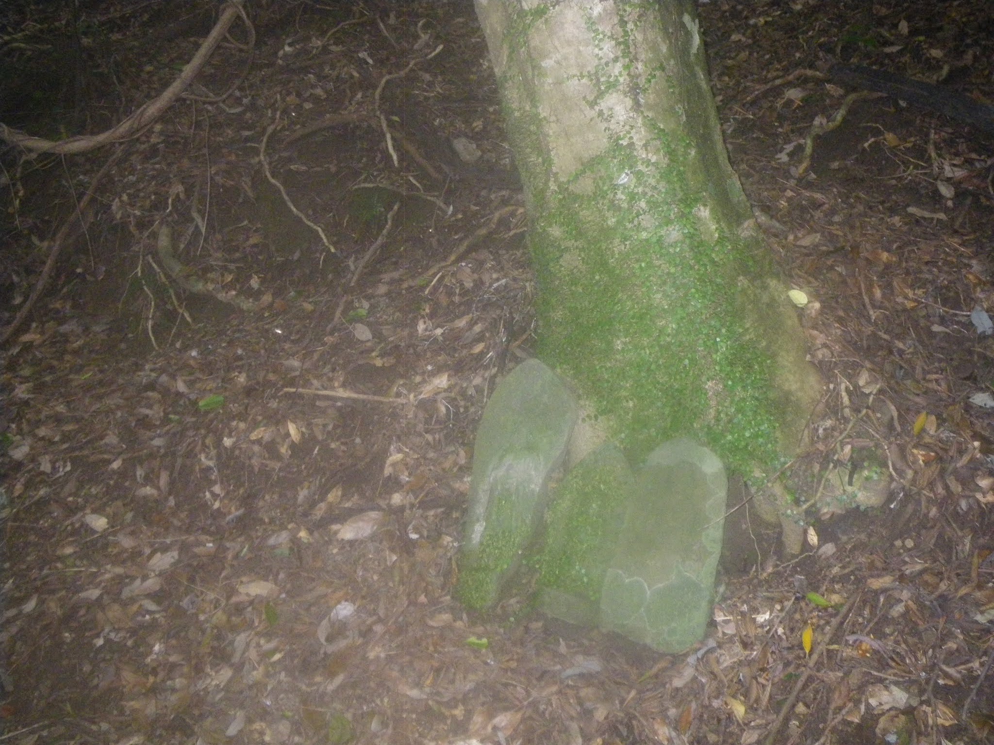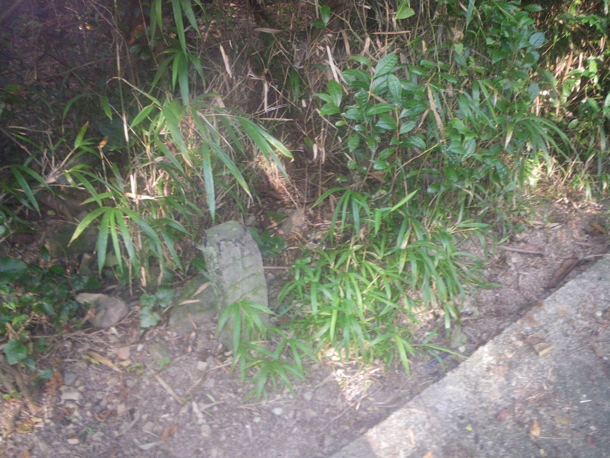 そのひとつが、この「遍路道 塚地峠あと600m」の標識の少し先にあるという摩崖仏ならぬ「摩崖丁石」。上述の文化遺跡オンラインにあった「塚地坂を南に下って沢と合流する付近の岩塊には丁石としての文字が刻まれ,それに尊像が添え彫りされている」とあるのがこの史跡だろう。