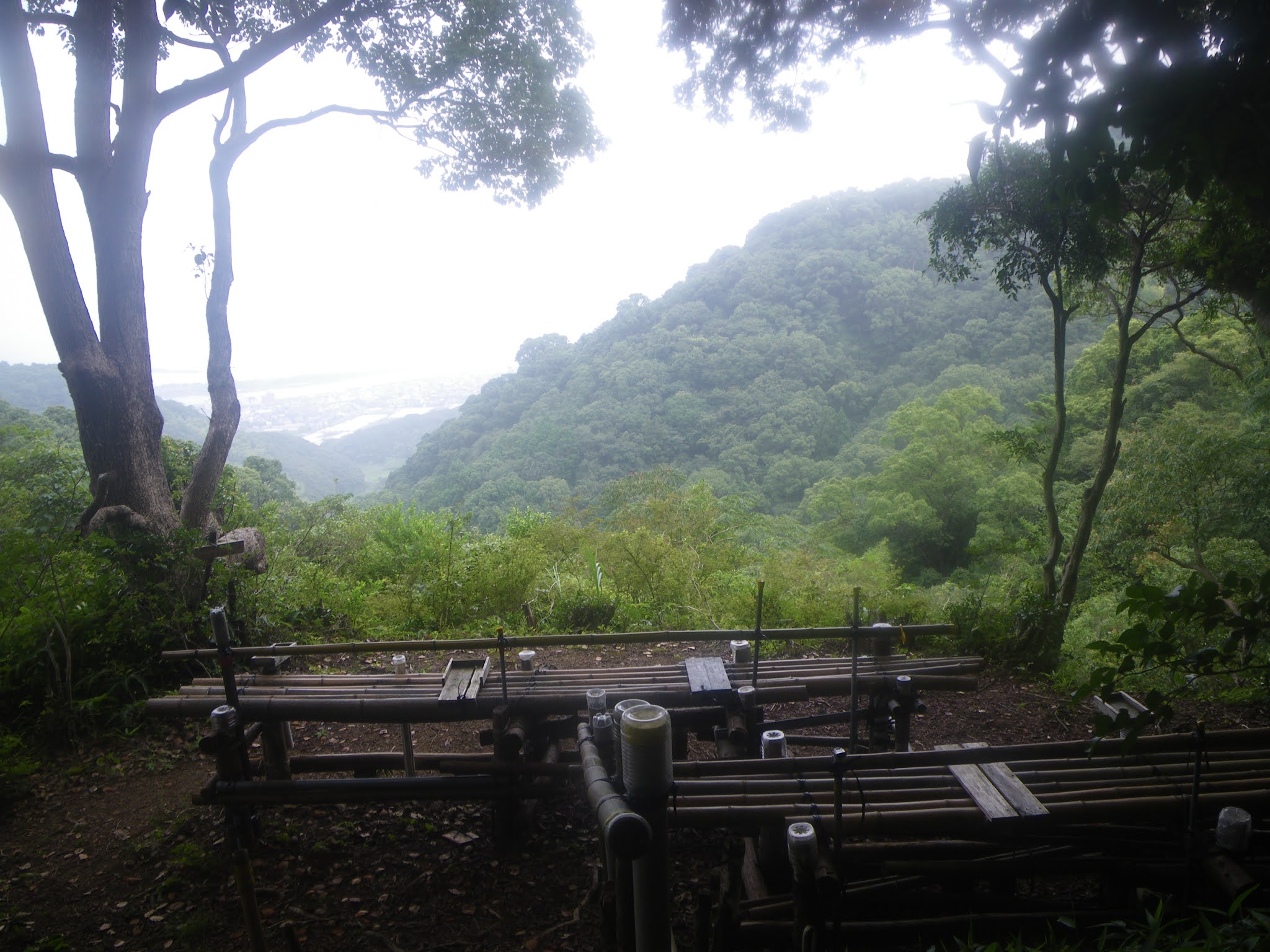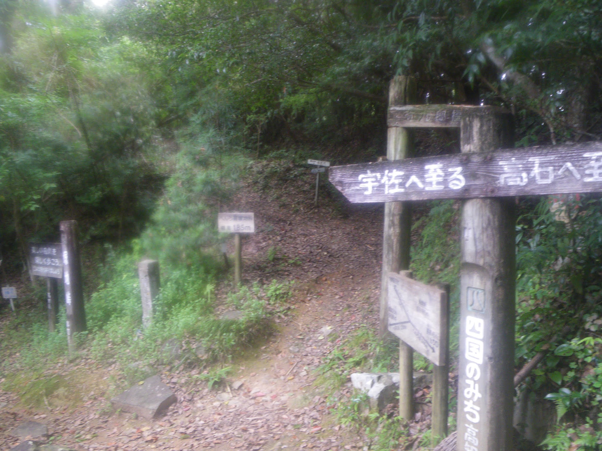 上り口からおおよそ30分弱で峠に到着。峠には「へんろ道 塚地峠 標高185m」の標識の他多くの道案内の「標識が立つ。「宇佐」「高石(私注;弥九郎橋を渡った北側の地)」、「弥九郎橋」「大峠展望所」、またハイキングコースの案内もあり西の「大峠展望所」や「茶臼山」「波介山公園」への概要図があった。