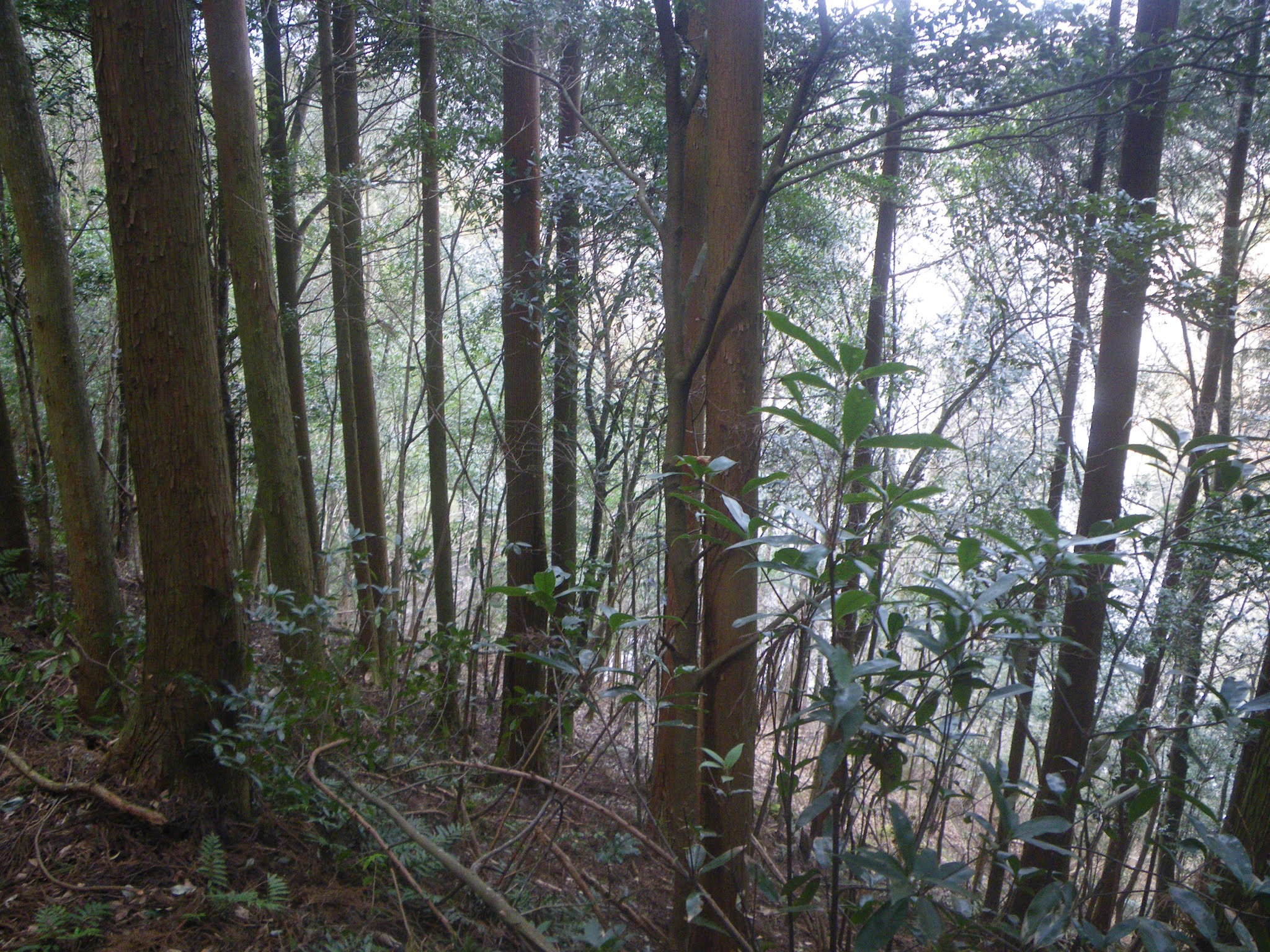 道の消えた荒れた沢筋を抜けるとぼどなく尾根筋に。おおよそ等高線530m辺りを廻り込み、沢筋から8分ほどで杉林を抜け前面が開ける。