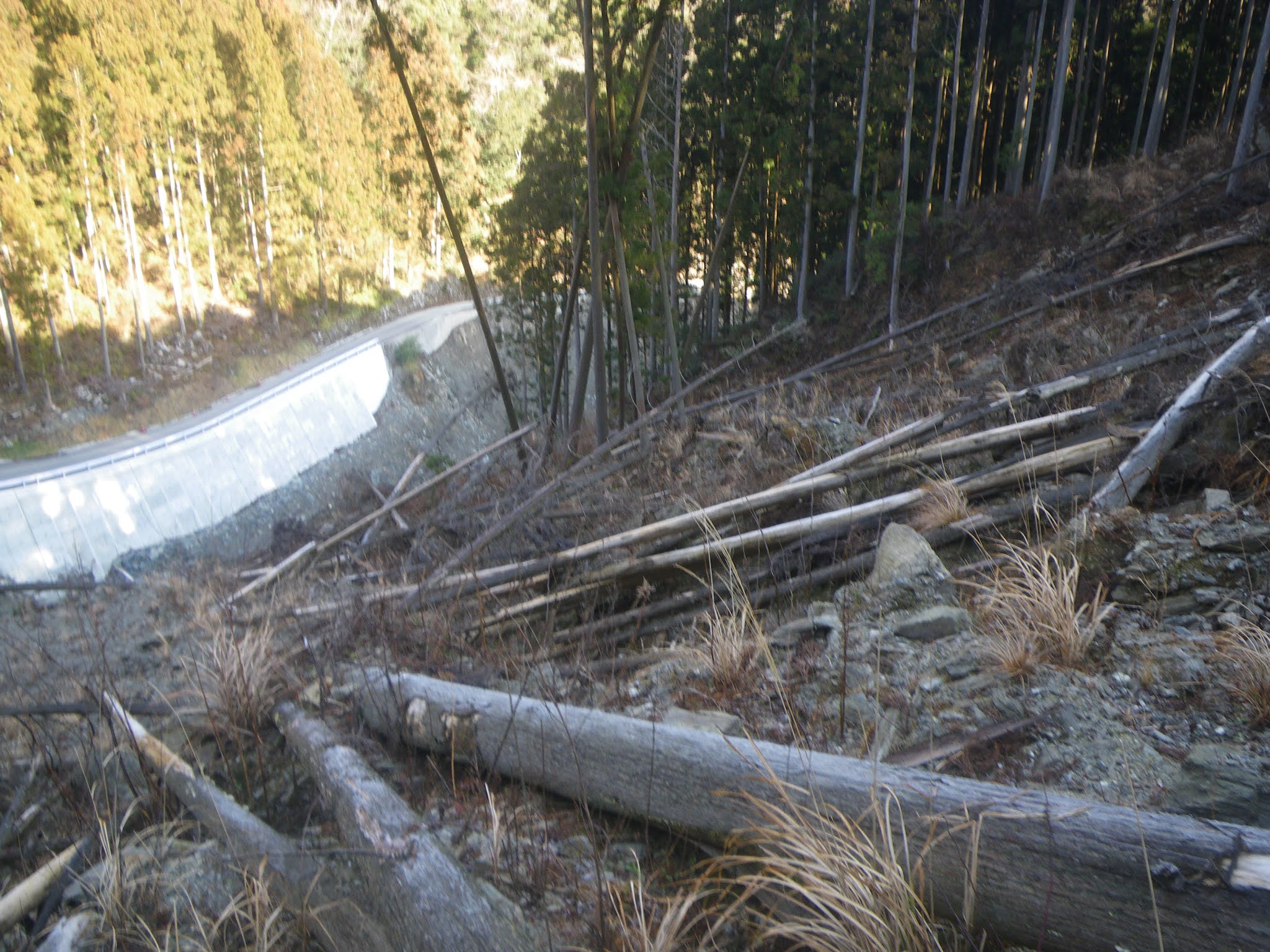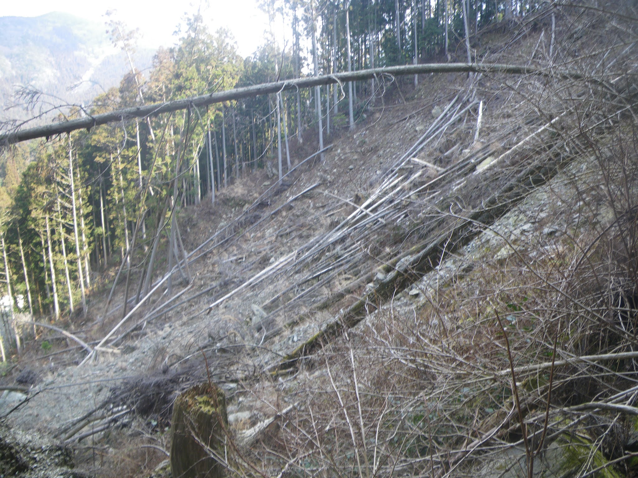 土佐地名往来」には「北山越えの官道が通る傾斜のきつい山地。崩壊を恐 れ千本の杭を打ち込んだ苦労を刻んだ地名」とあった。大崩落斜面を見るにつけ、地名はその地形を表すことを実感する。