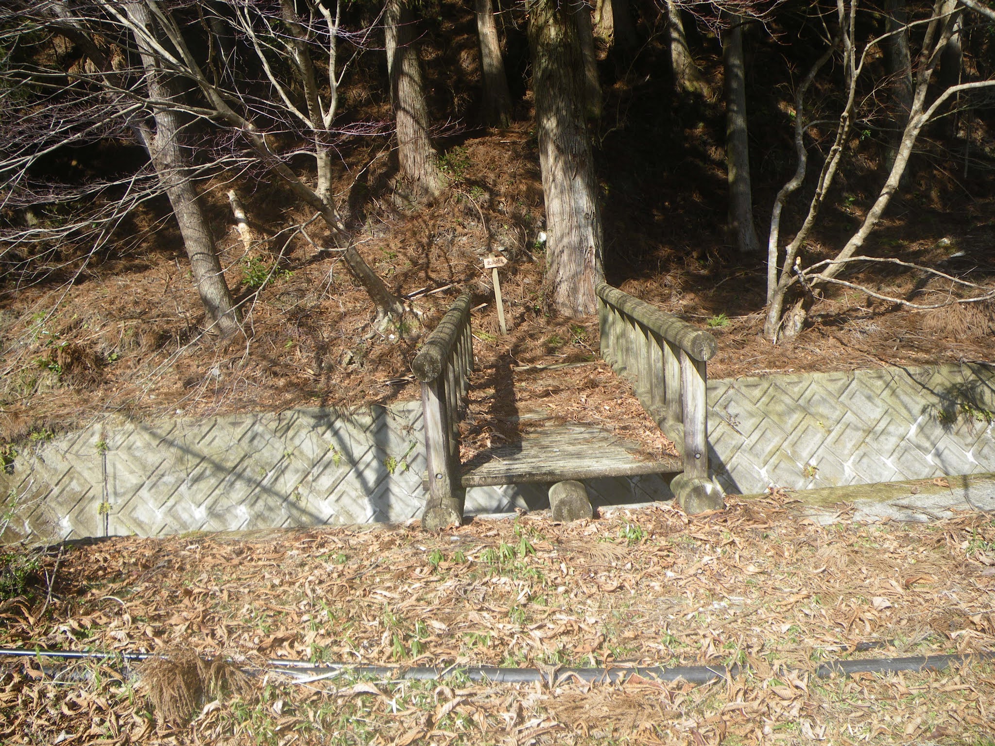 石垣のある敷地の中に入り建屋を越えた所で道を逸れて草の茂る広場を横切る。その先に見える木の橋が目印。