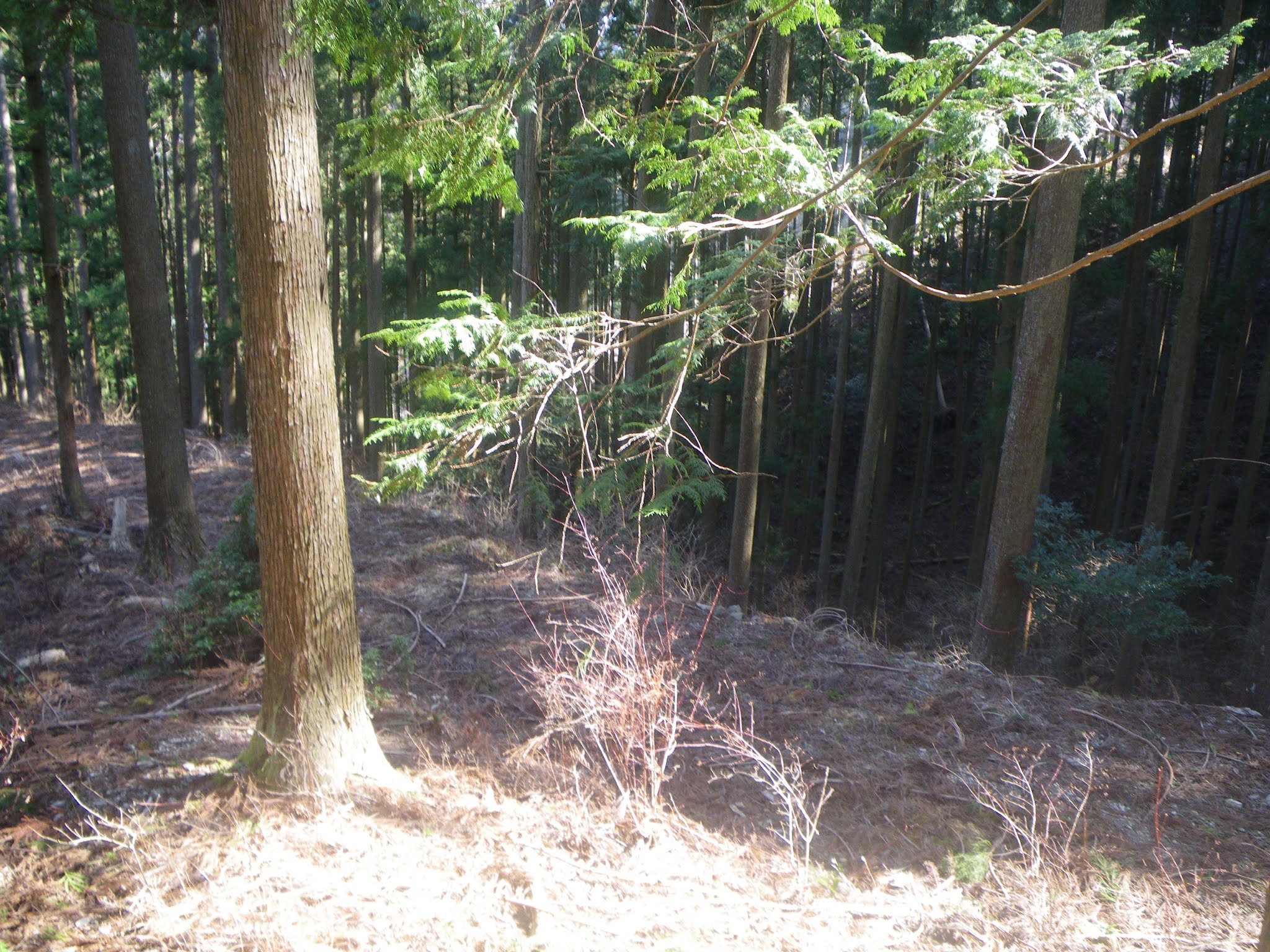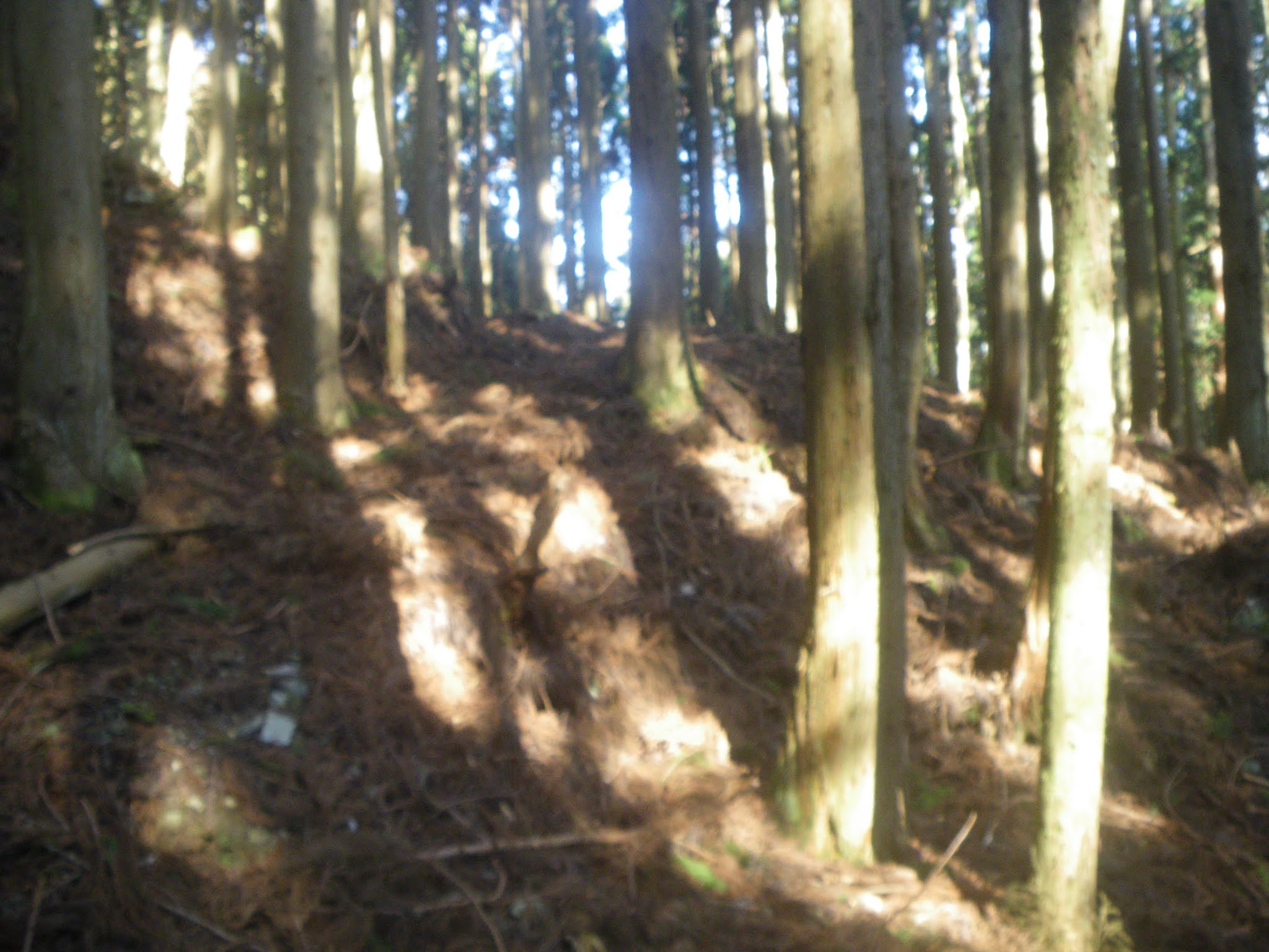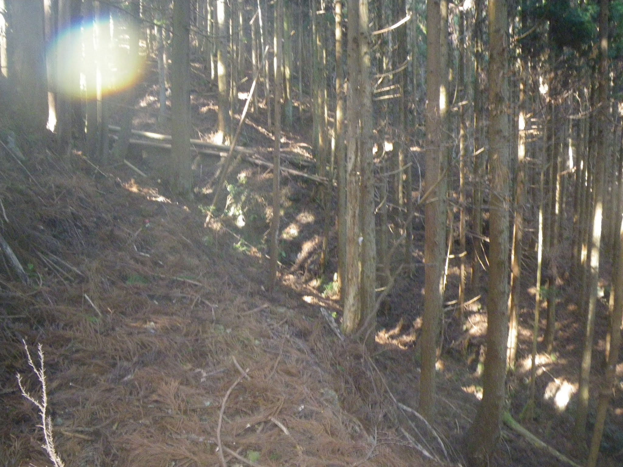 踏み込まれた道をしばらく進むと杉林で道が消える。杉の枝葉が一面に落ち道筋が全くわからない。特に標識もない。ここは左手山側に向かい踏み込まれたような道に出るまで我慢するしかない。要点としては国土地理院の地図に描かれた破線の山側に進むこと。