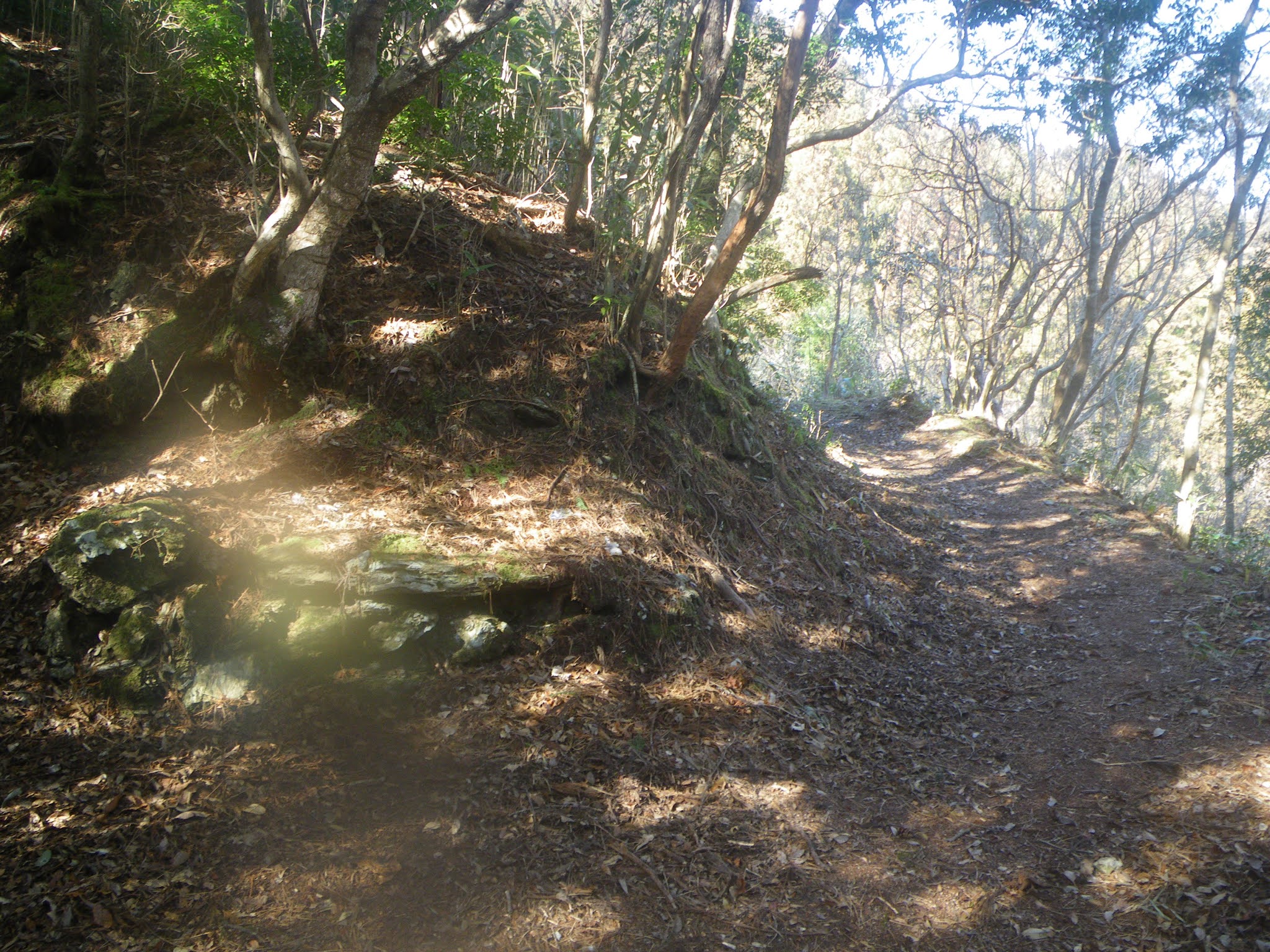 二回目の道繋ぎでわかったのだが、土佐北街道は一回目に出た40mほど上で尾根筋を廻り、そこから尾根の西側をトラバース気味に下山箇所に進んでいた。