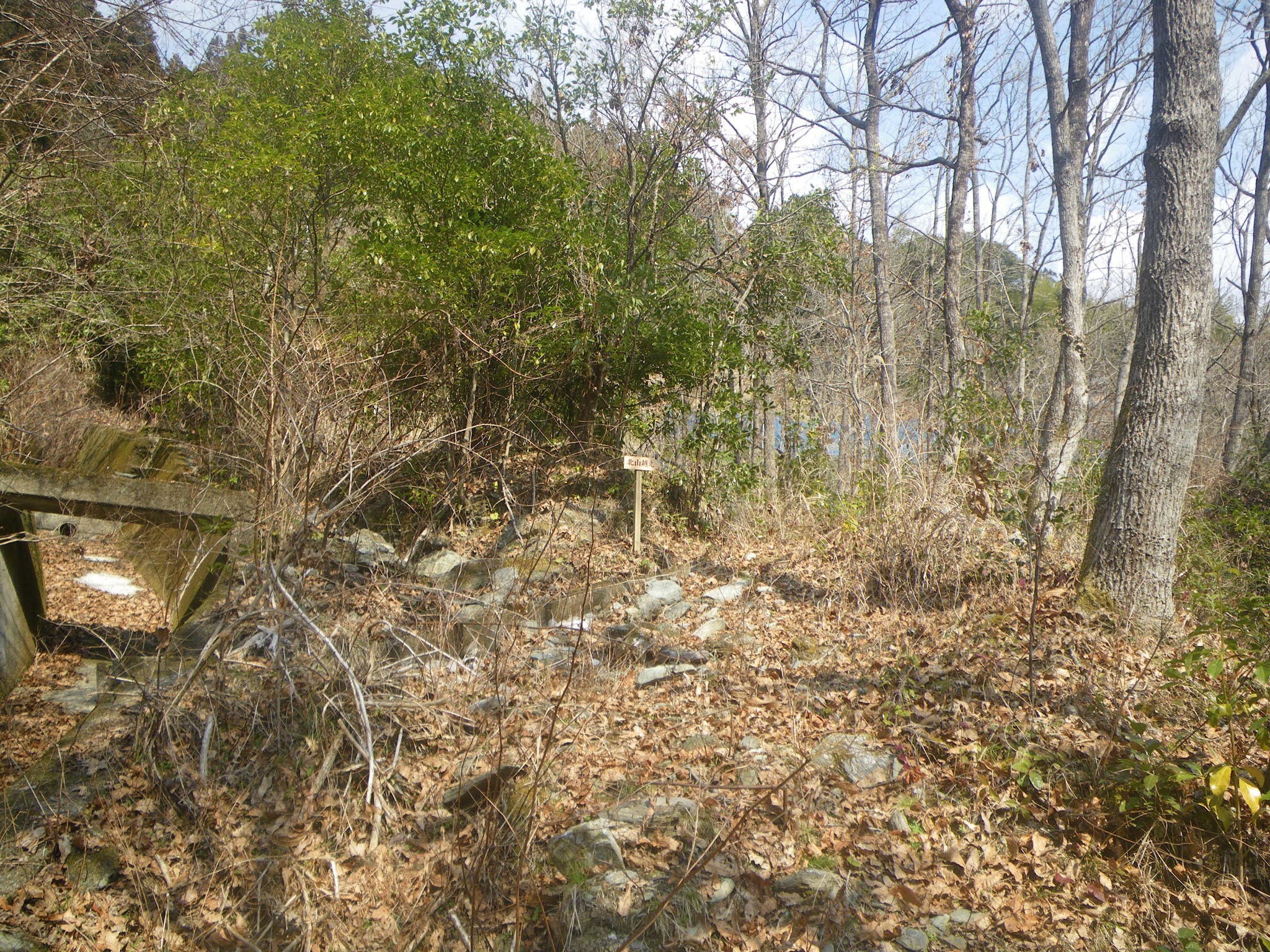 石垣の中の敷地に入った道は山に向かって上ってゆく。右に折れる箇所には何も標識がないため、知らず先に進んでしまう畏れあり。実際私も道をしばらく上り、なんとなく「これは違うよな」と作業所辺りまで戻り、遠めに見える橋を見付けルートに入った次第。開けた場所に出てからオンコースの右折までに時間がかかっているのはそのためである。