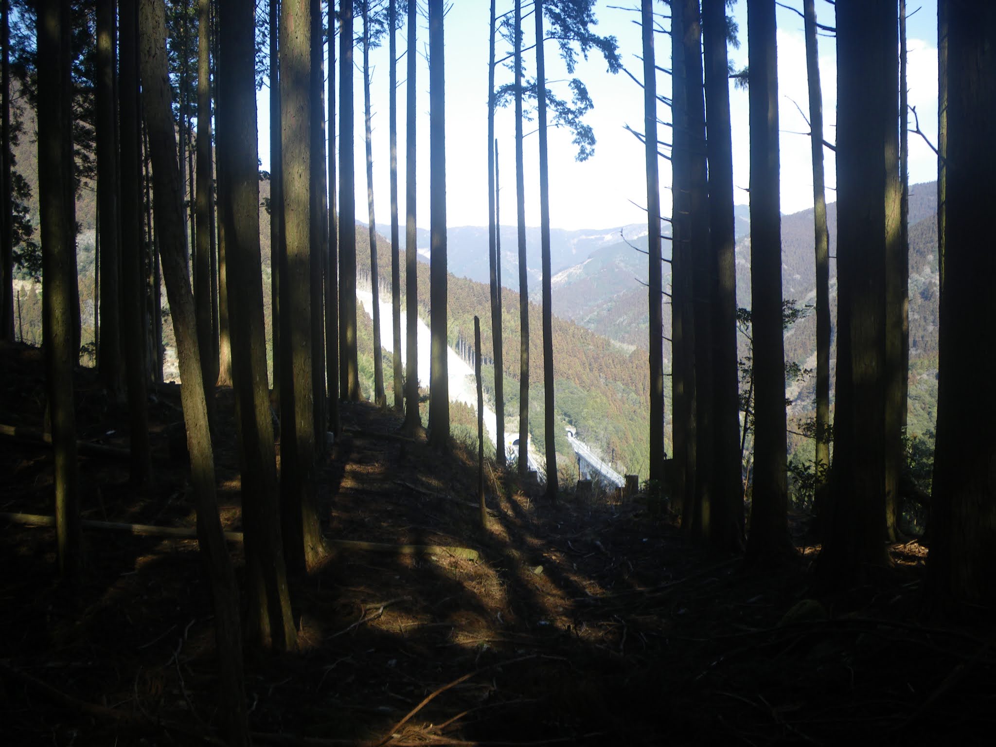 支尾根よりトラバース気味に枝尾根に進む。道はしっかり踏み込まれ迷うことはない。途中倒木が道を塞ぐ。遠景を楽しんだところから15分ほど歩くと左手下に林道が見えてくる。往路で這い上がりこの道筋を見付けた林道だ。