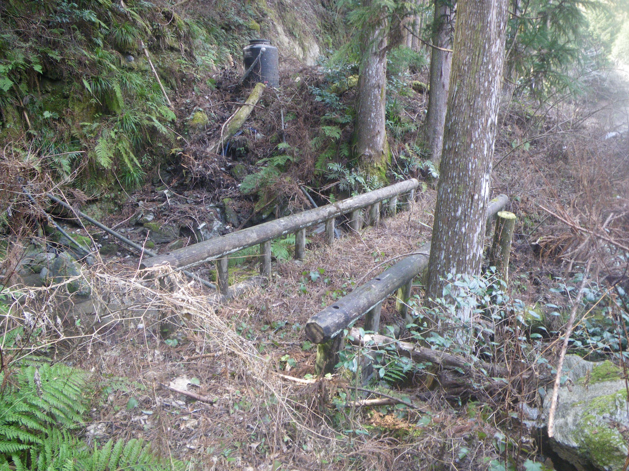 木橋から数分歩くと「参勤交代道」の標識。左を指す。川筋から離れ山に入っていく。その先に石垣があり舗装道に出る。高知道の作業道だろうか。コンクリート擬木の手摺のついた石段を上る。
