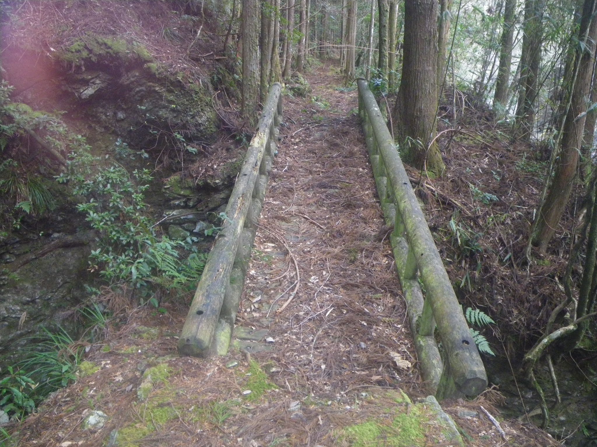 林道手前に小さな木橋が架かる。これが千本しらや橋。往路、この地が土佐北街道であることを知り、先回撤退した道迷い箇所まで繋げることができた。イントロでもメモしたが道迷いで撤退した時は、逆側のはっきりした地点より逆から攻める手法で道を繋げることが多い。土佐北街道の権若峠越えのときも、同様の手法で道を繋ぐことができた。