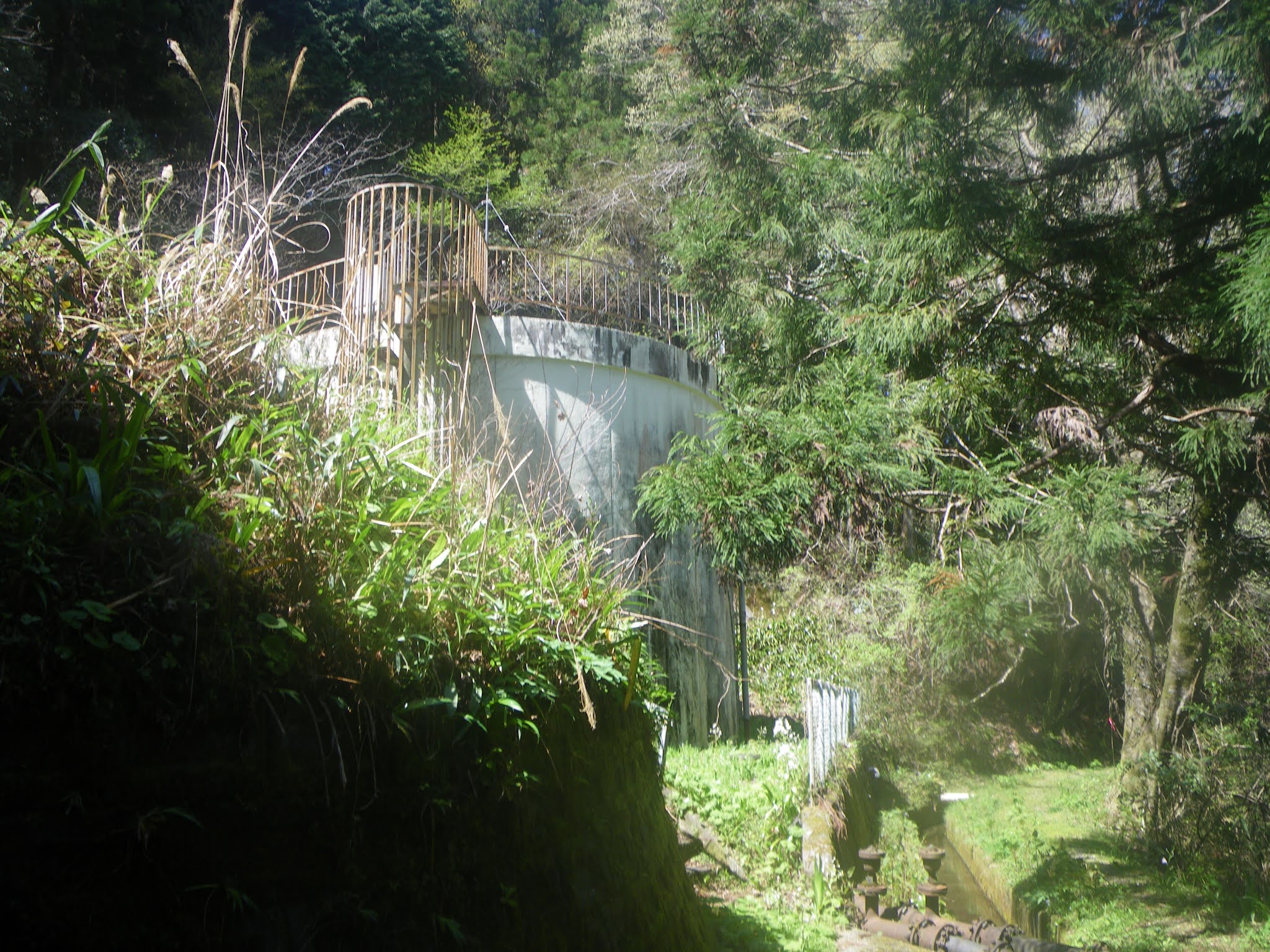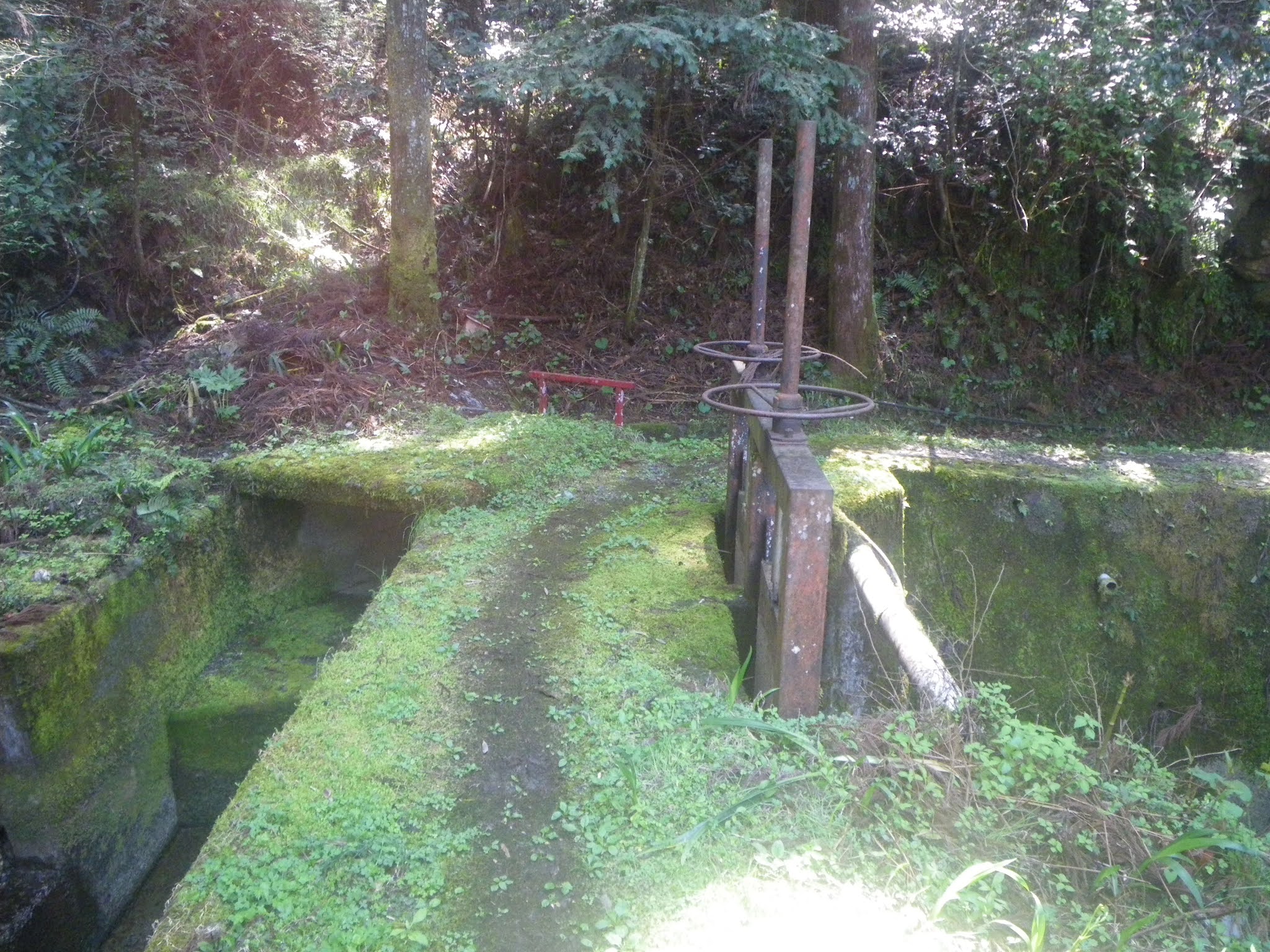 水路は南に切れ込んだ沢の突端部をコンクリート補強されて渡る。鉄製水門が設けられ沢の水も含め、水は沢に落ち、水門から先水路に水は無くなる。標高は305m程だろうか。沢を越えると直ぐ、山側に貯水槽といった施設(標高300m辺り)。