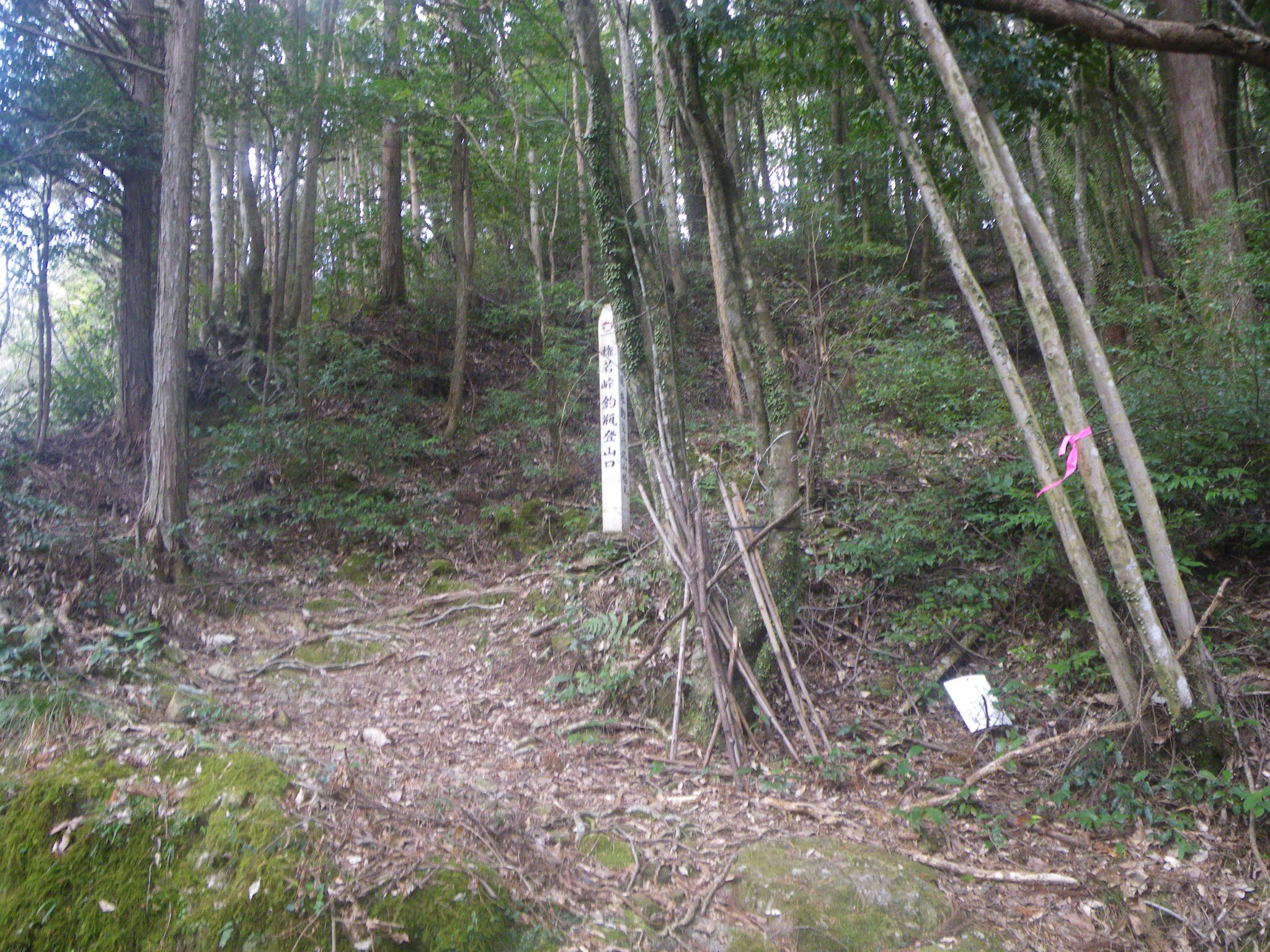 貯水槽から5分弱、「城山の森」と書かれた木の標識が立つ(標高298m)。標識は水路進行方向を指す。地図を見ると水路の20mほど下を走る土佐北街道の道筋から標識まで実線が記される。町からこの道筋を上井筋まで上り、水路に沿って先に進み十二所神社のあたりから城山へと上るようである。