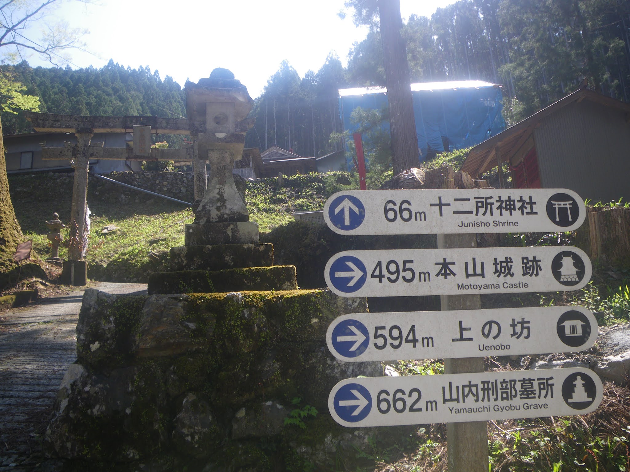 鳥居前には「↑66m 十二所神社」「→495m本山城跡」「→594m 上の坊」「→662m 山内刑部墓所」といった散策案内があった。