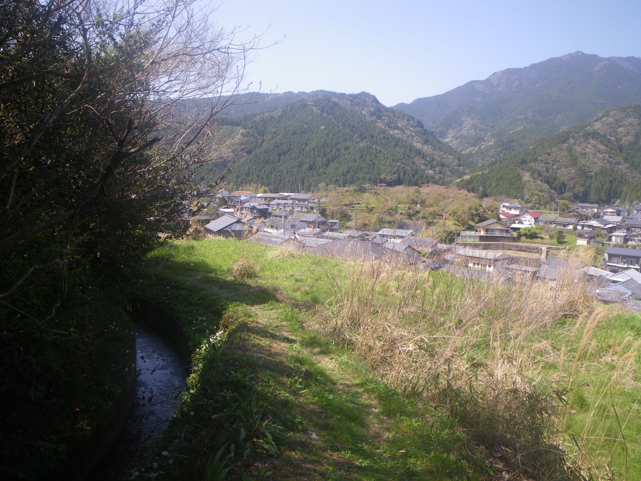 前方、一段低いところにに本山の町並みが見えてくる。用水路が開かれらた当時は一面の田圃ではあったのだろう。