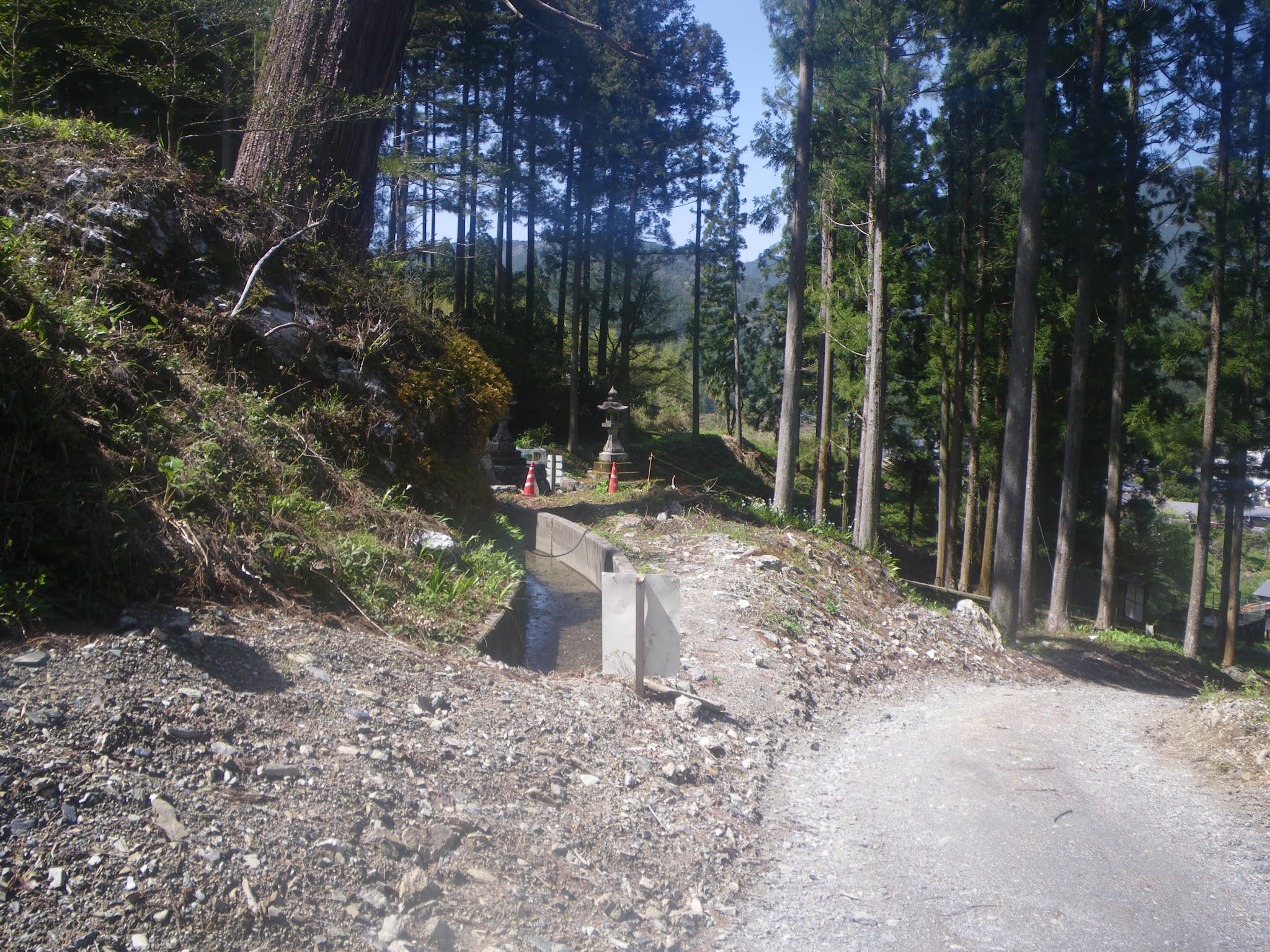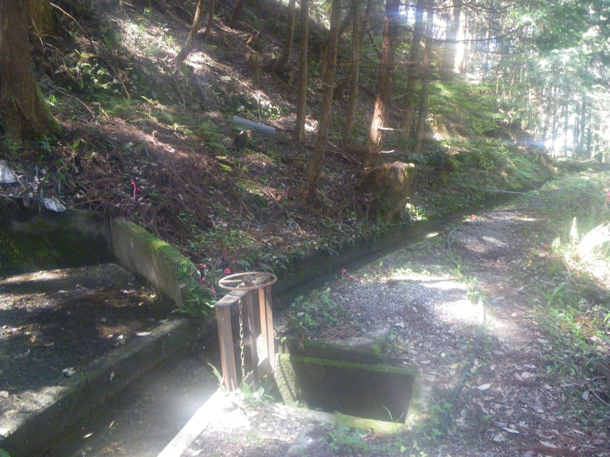 大岩を越えると右手、木々の間から谷側に耕地が見えてくる。大岩から数分で分水門。このあたりから分水された水は灌漑用に落とされているように思える。