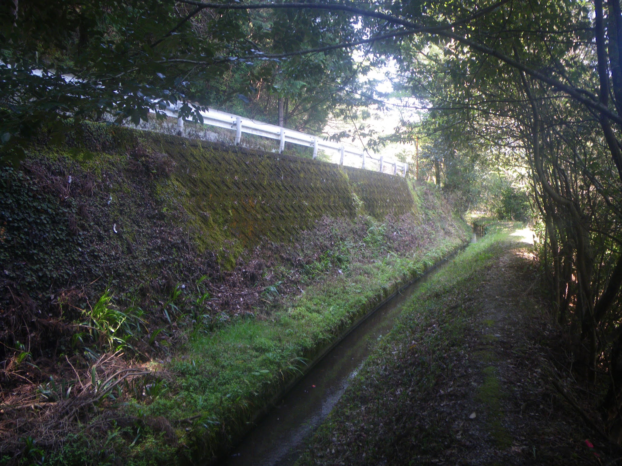 舗装された生活道から離れた水路は再び木々に覆われた山裾部の少し上を進むことになる。「上の坊」への道から9分ほど歩くと、南に切れ込んだ谷筋を渡る。