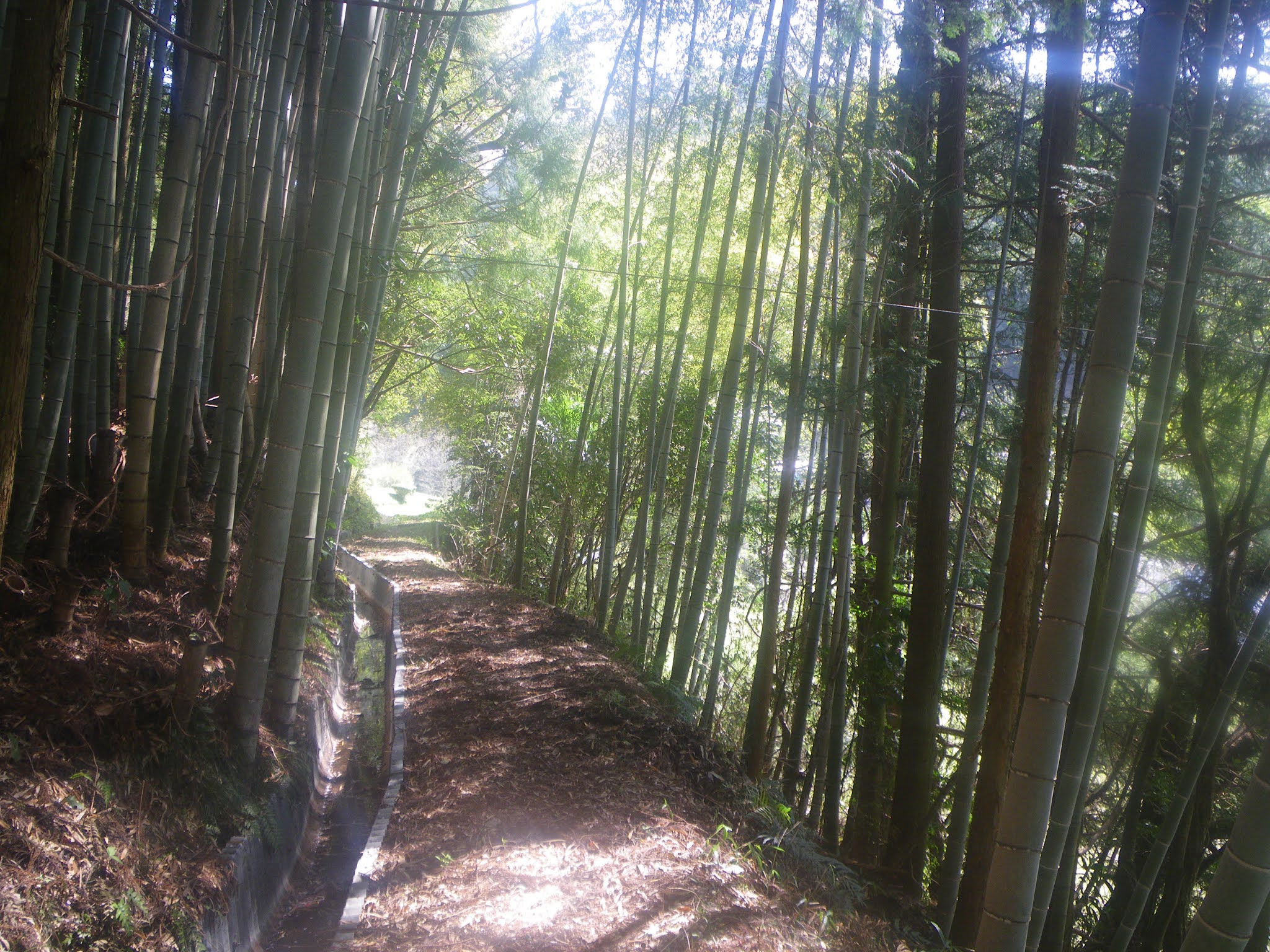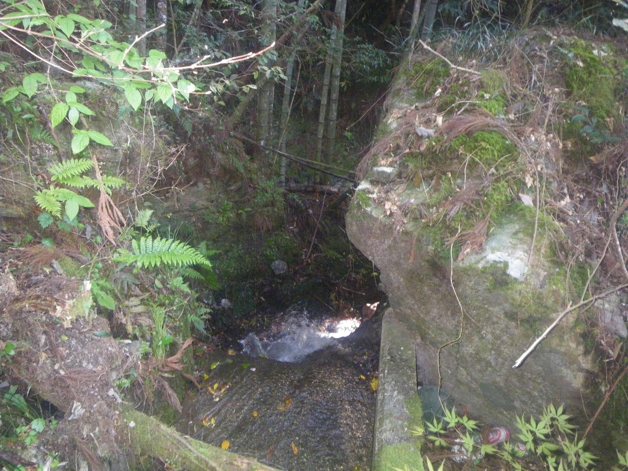 水路の谷側にも柵が設けられていたが、それも直ぐに無くなり、竹林や杉林の中を10分ほど歩くと南に切れ込んだ沢に出合う。