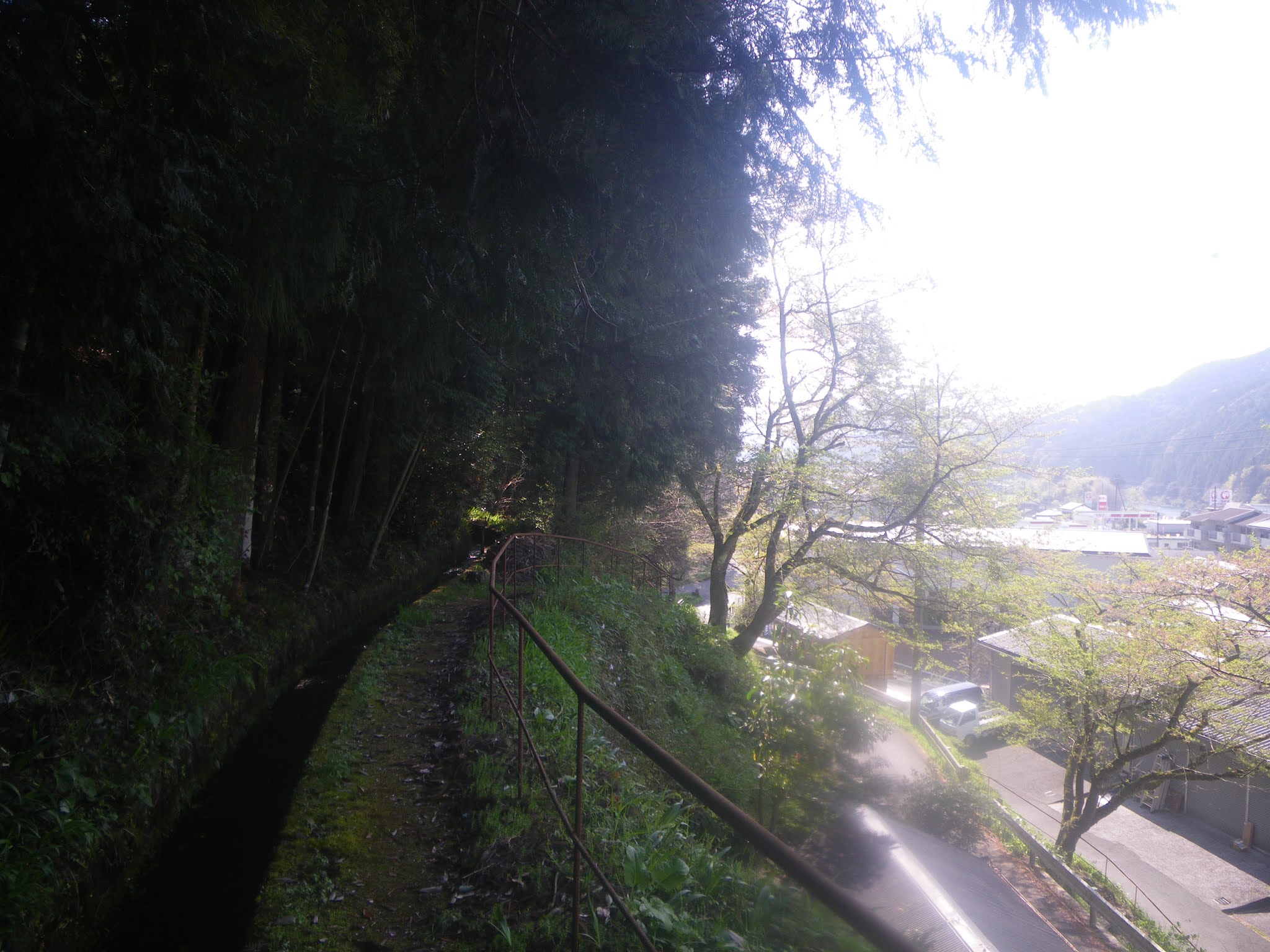 余りに勢いのいい分水が何処に流れ落ち、何処に向かうのか、ちょっと気になる。いい塩梅、というか水門調整の作業道が旧国道へと下りている。作業道を下りると旧国道へと下る坂道を潜り、旧国道に沿って町へと東進していた。