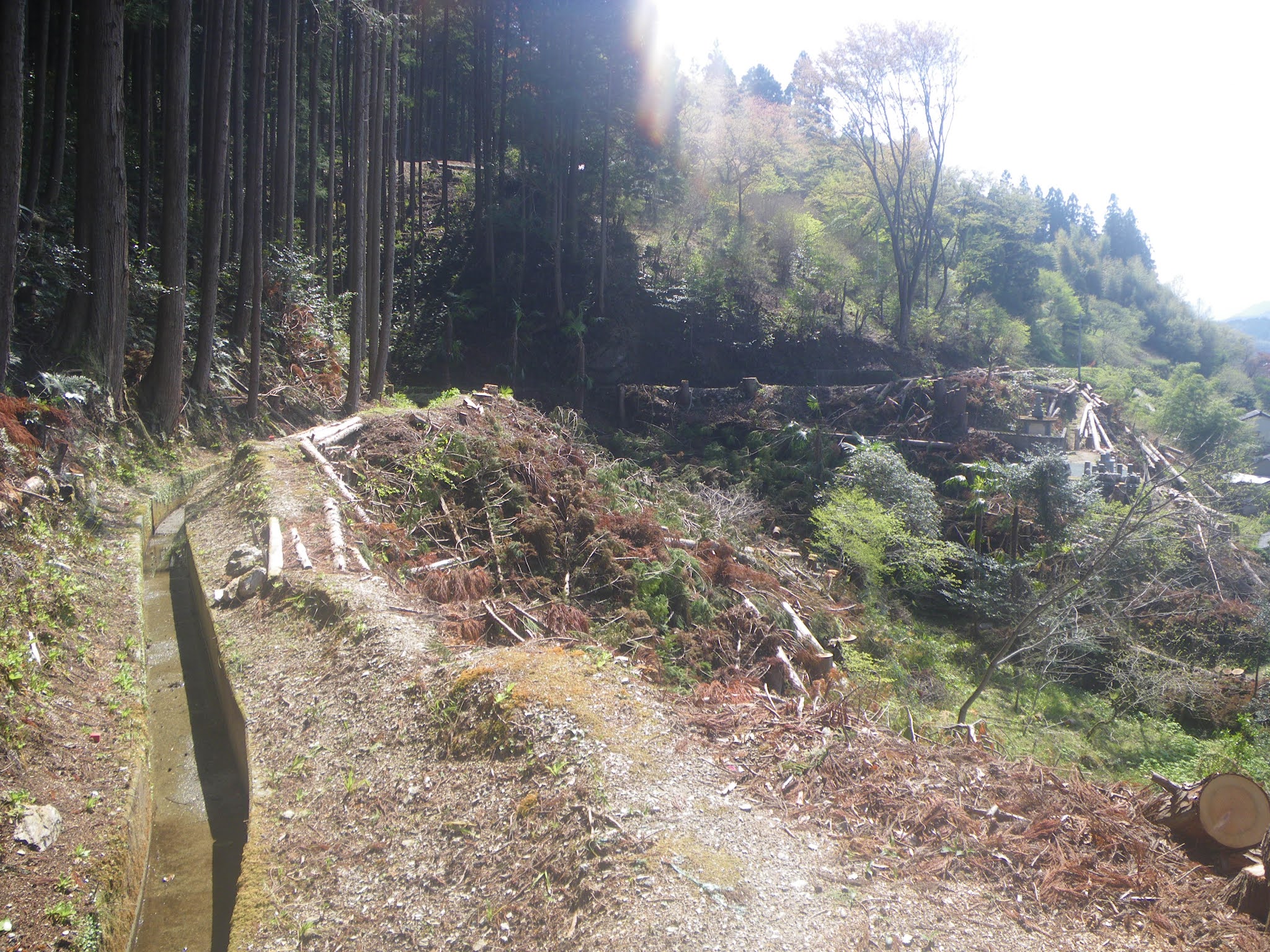 枝尾根の先端部を回り込んだ水路は、南に切れ込んだ沢筋に向かう。沢は砂防対策の工事中。コンクリート砂防堰らしきものが造られていた。水路はこの工事箇所の前後は地中に埋まり、沢を渡るところで顔を出す。標高294m。